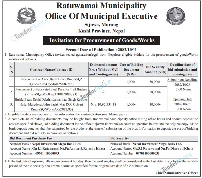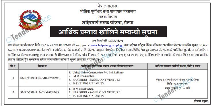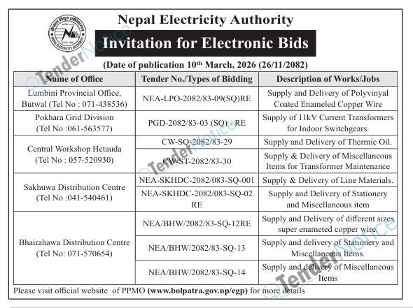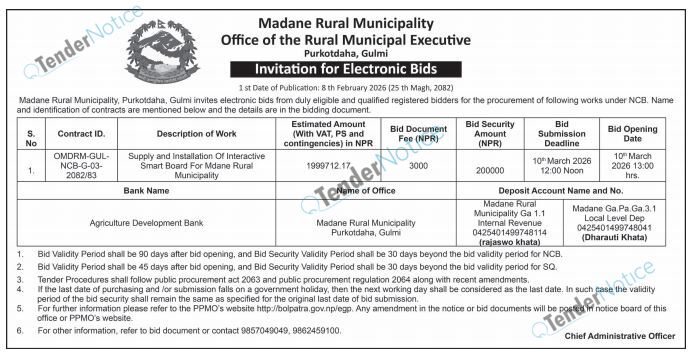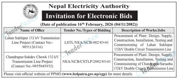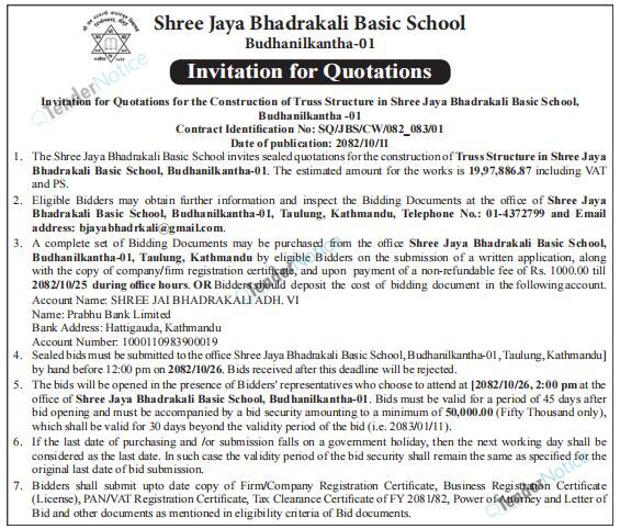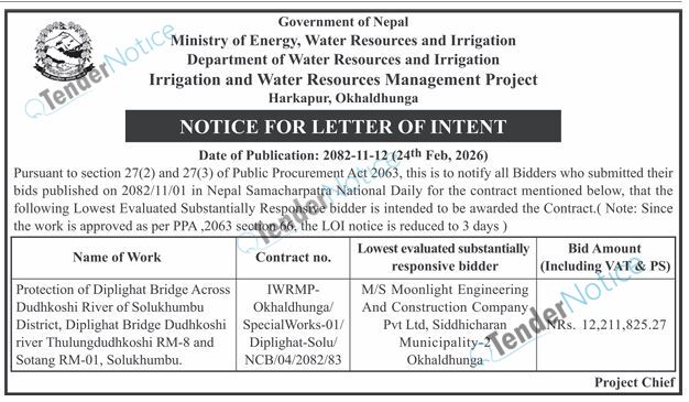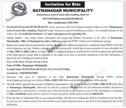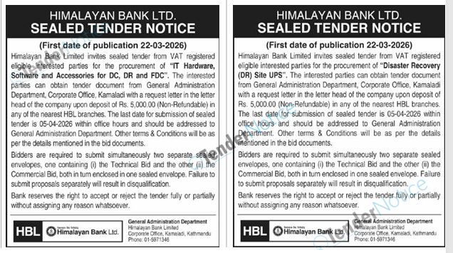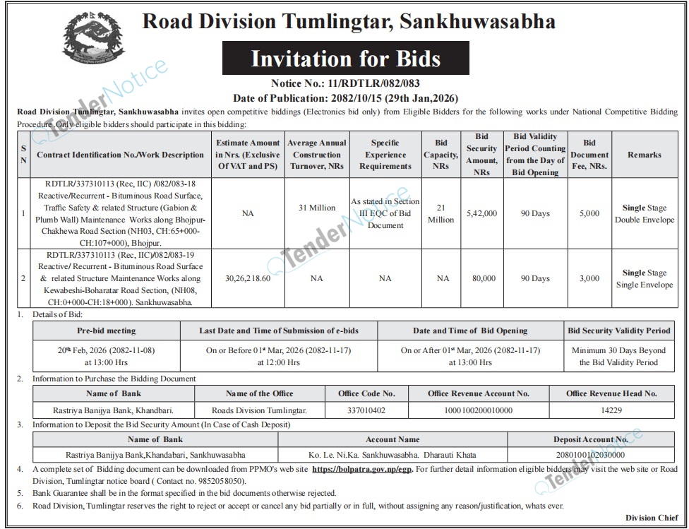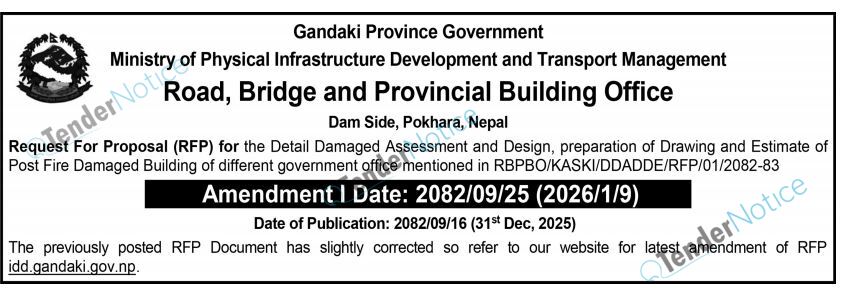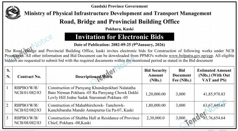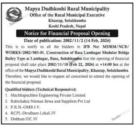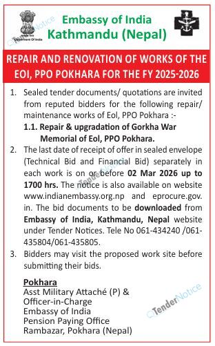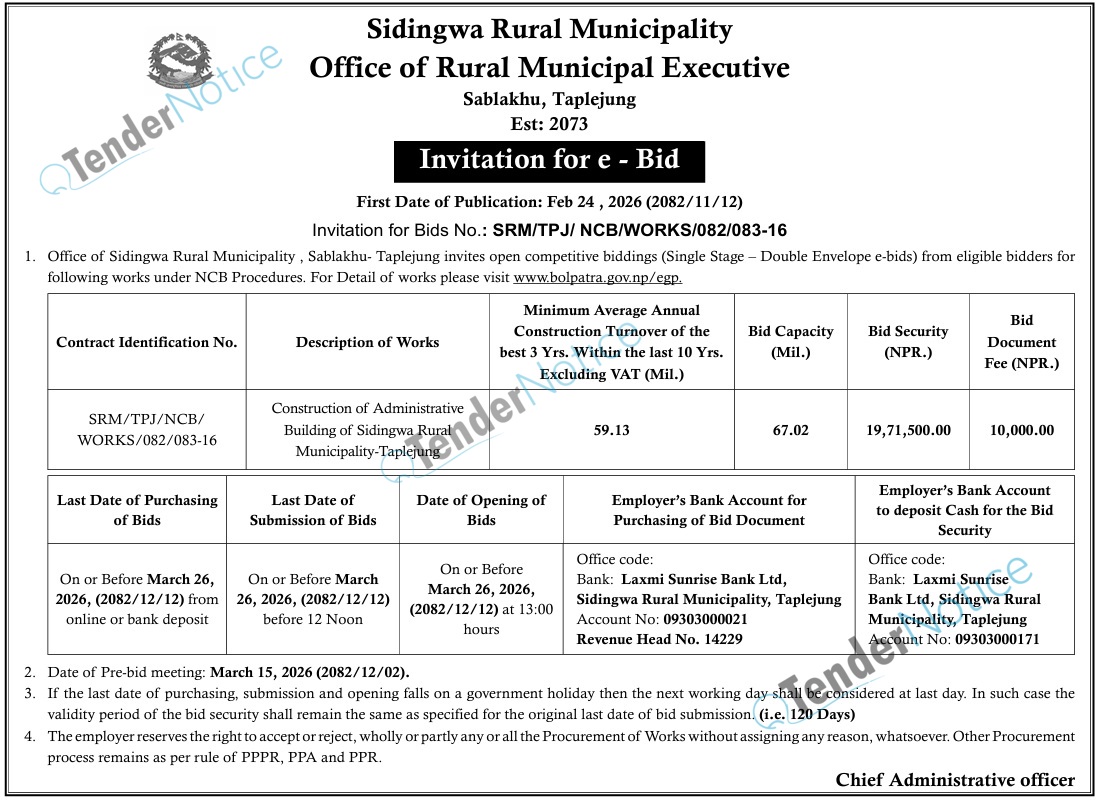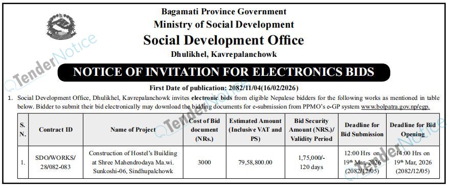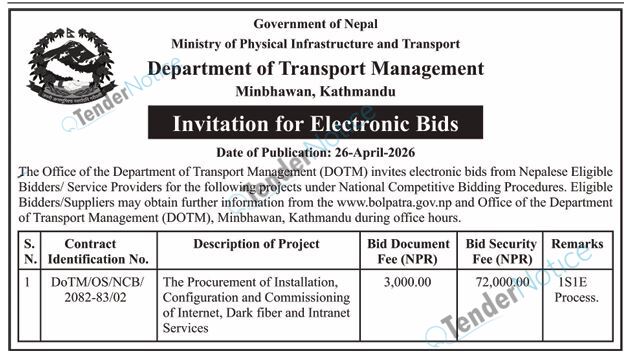 TenderNotice.com.np is one of the key sources of information for online tenders news and information. Those sources include Invitation of Proposal, Quotation, Request For Proposal (RFP) including Technical Proposal and Financial Proposal, Expression of Interest (EOI), Enlistment etc.