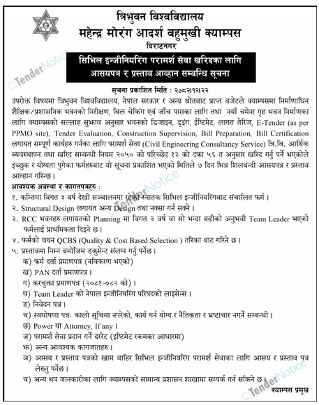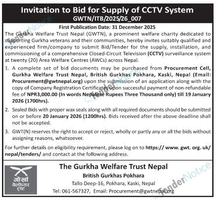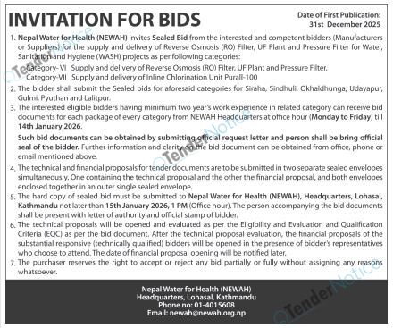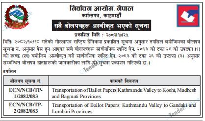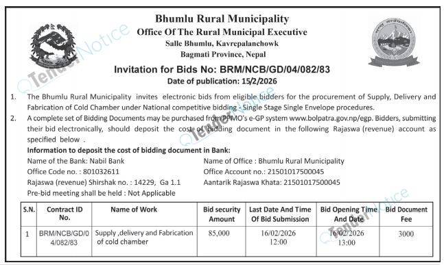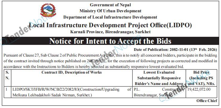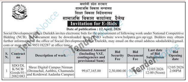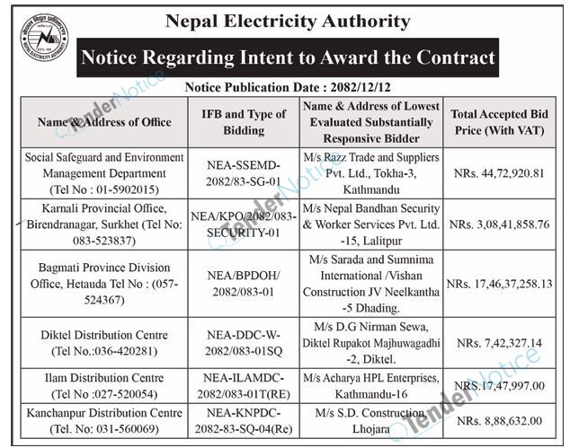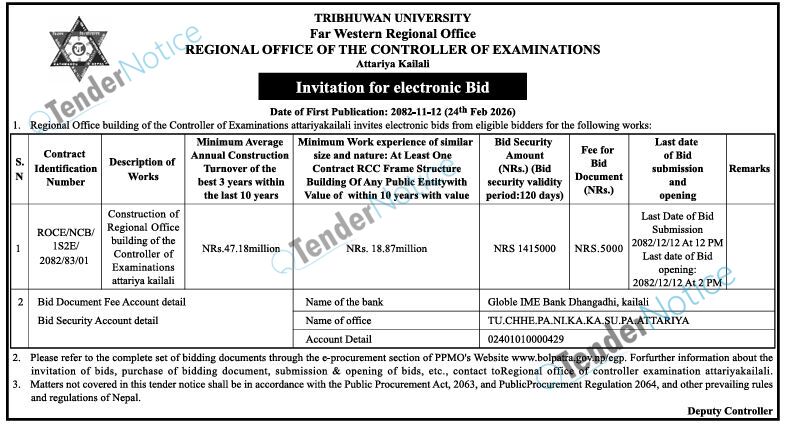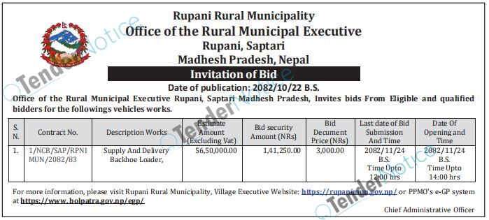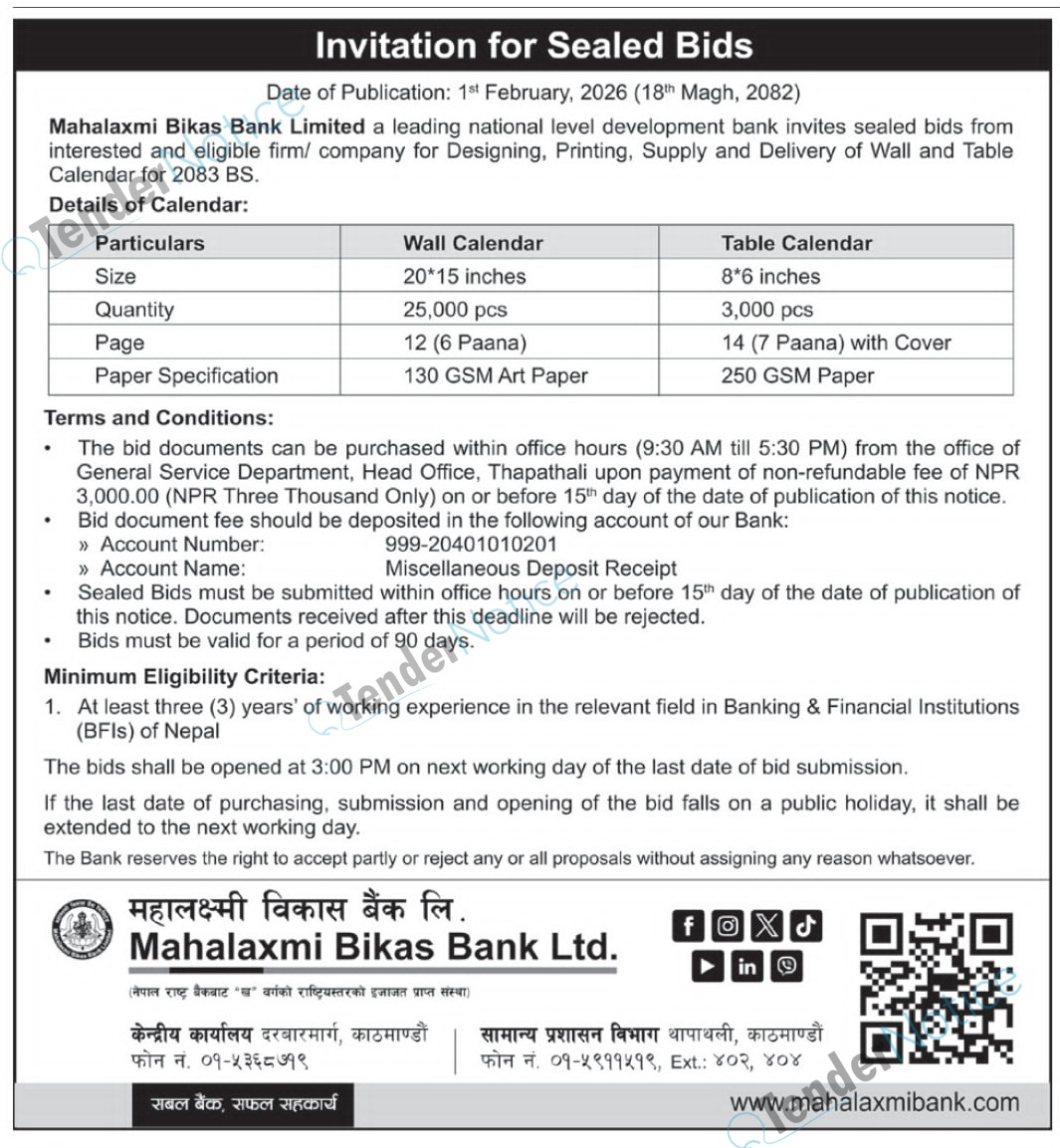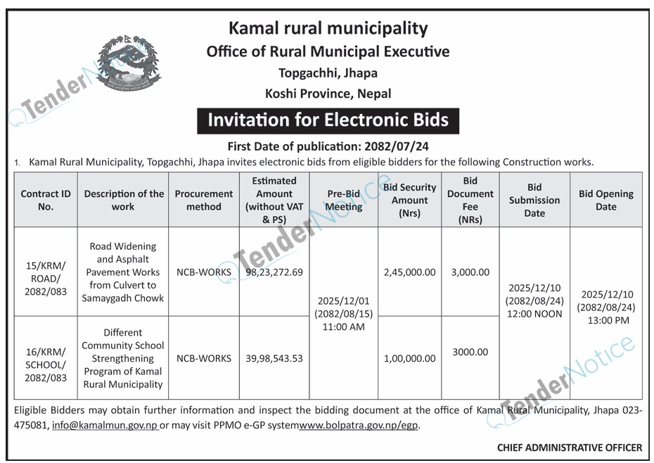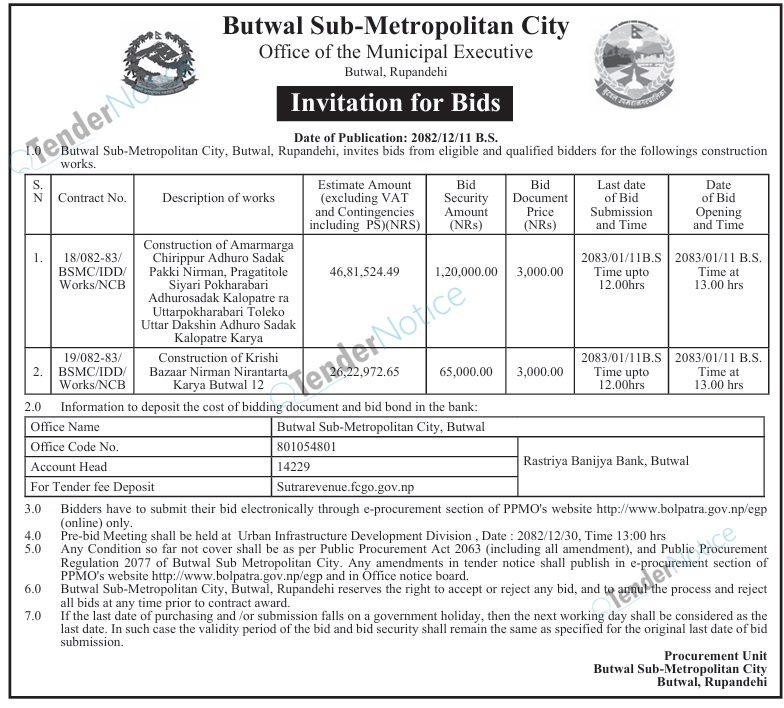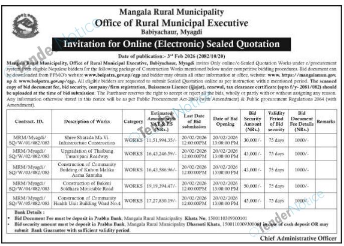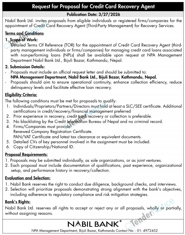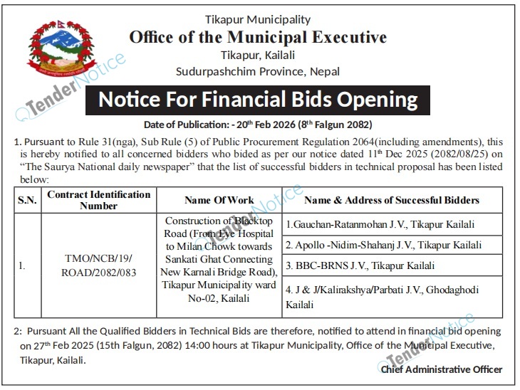 TenderNotice.com.np is one of the key sources of information for online tenders news and information. Those sources include Invitation of Proposal, Quotation, Request For Proposal (RFP) including Technical Proposal and Financial Proposal, Expression of Interest (EOI), Enlistment etc.