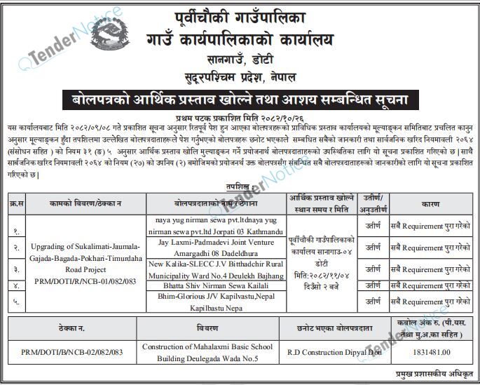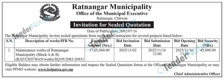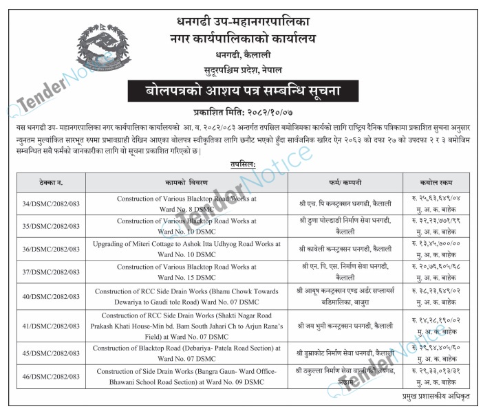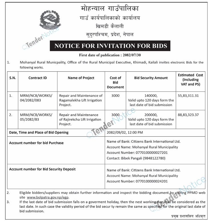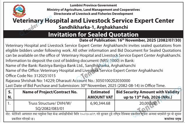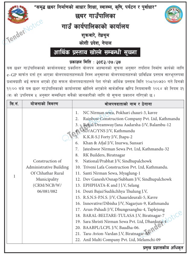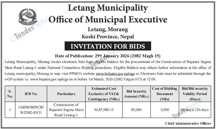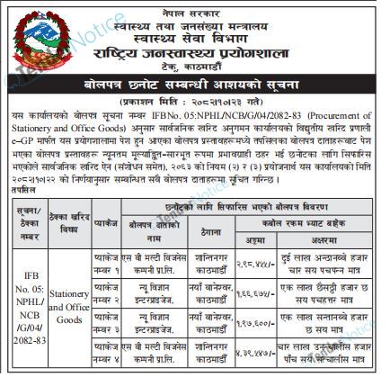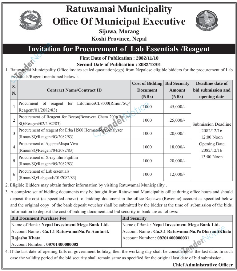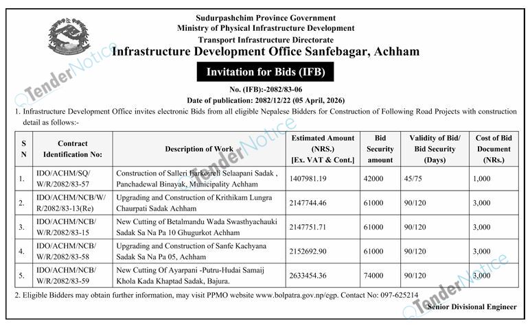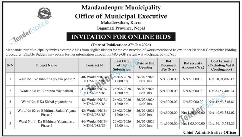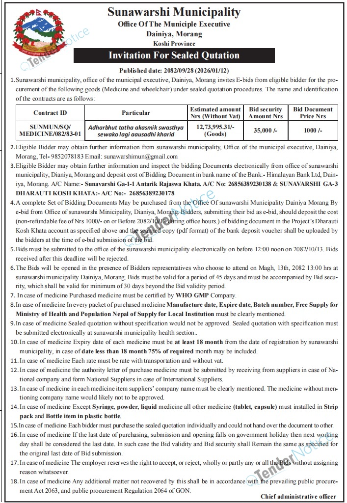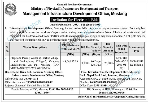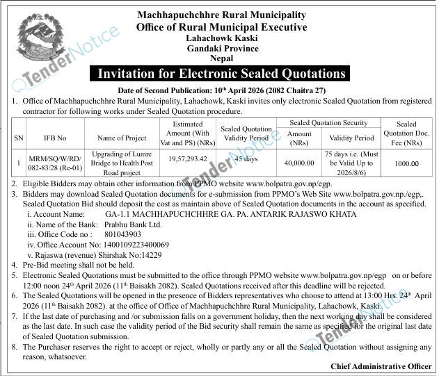 TenderNotice.com.np is one of the key sources of information for online tenders news and information. Those sources include Invitation of Proposal, Quotation, Request For Proposal (RFP) including Technical Proposal and Financial Proposal, Expression of Interest (EOI), Enlistment etc.
