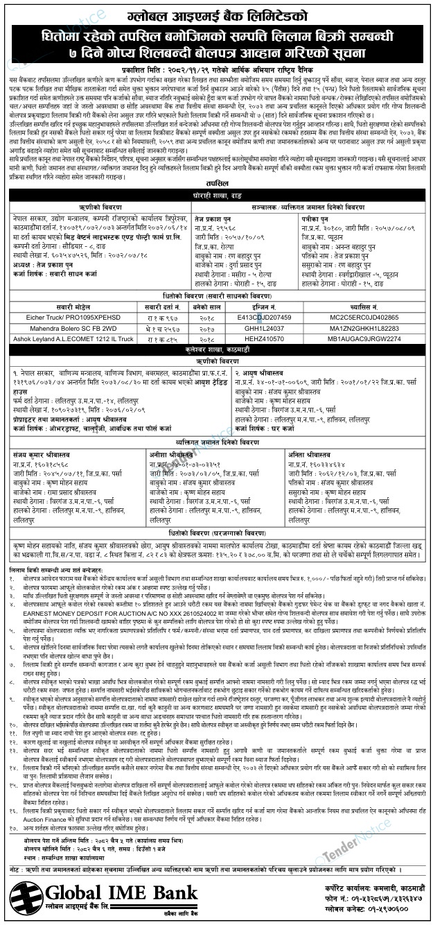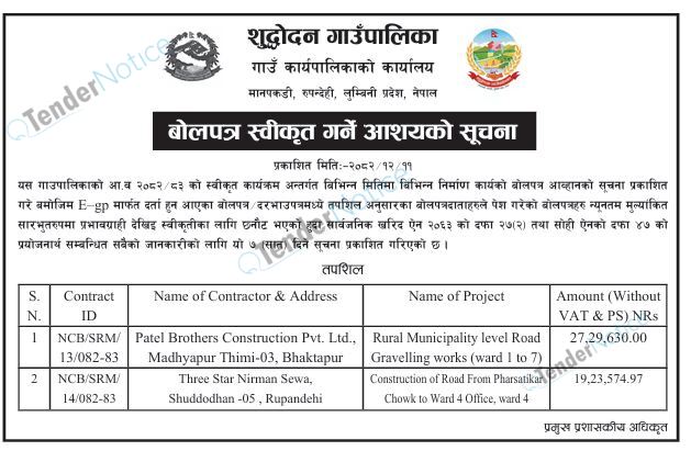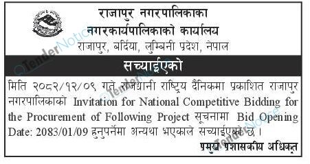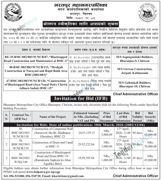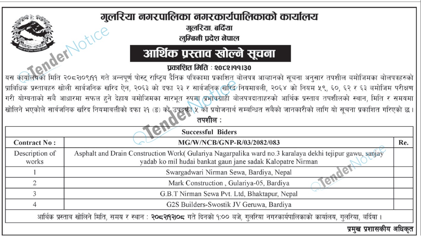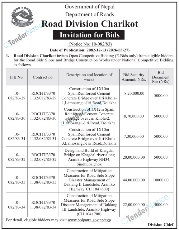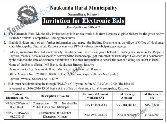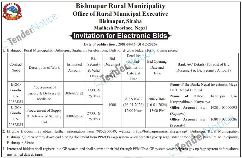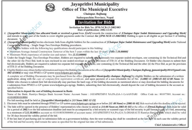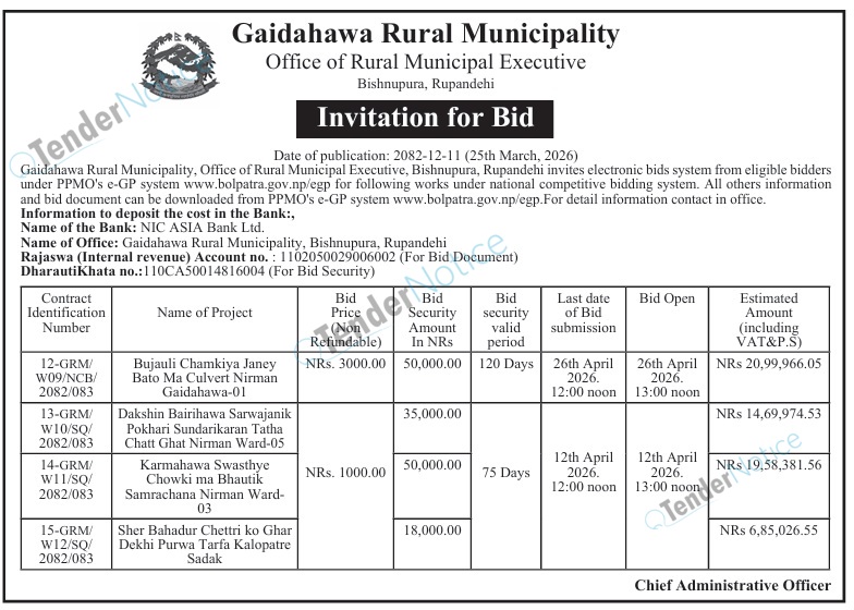 Tendernotice.com.np is an online Bid and Tender Portal Services that helps to manage all bids, tenders and related notices through website. All tender notices published in various newspapers in Nepal are collected and posted in the portal site daily basis. Users can access and download tender documents, receive through their emails right after tender publish and manage bids and tenders completely through online after registration. It simply facilitates and manages all bids and tender process in a simple manner for all users.