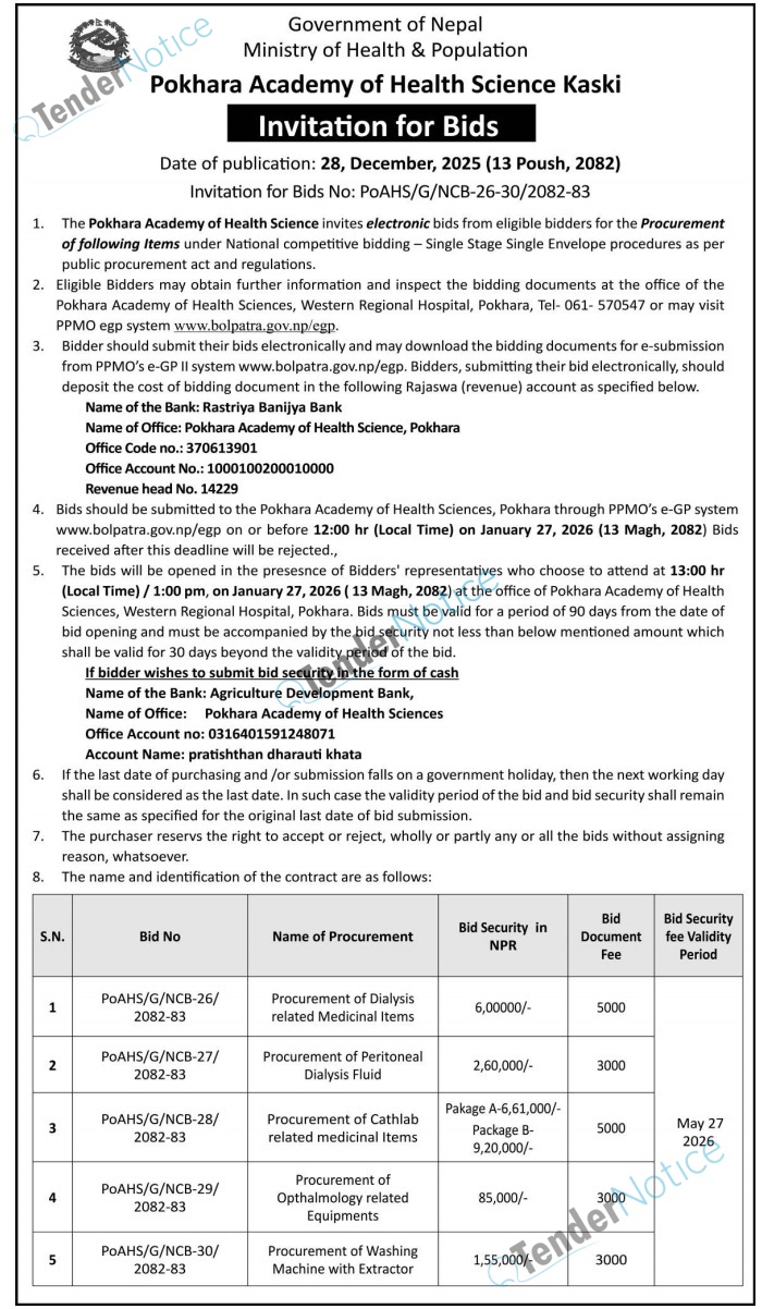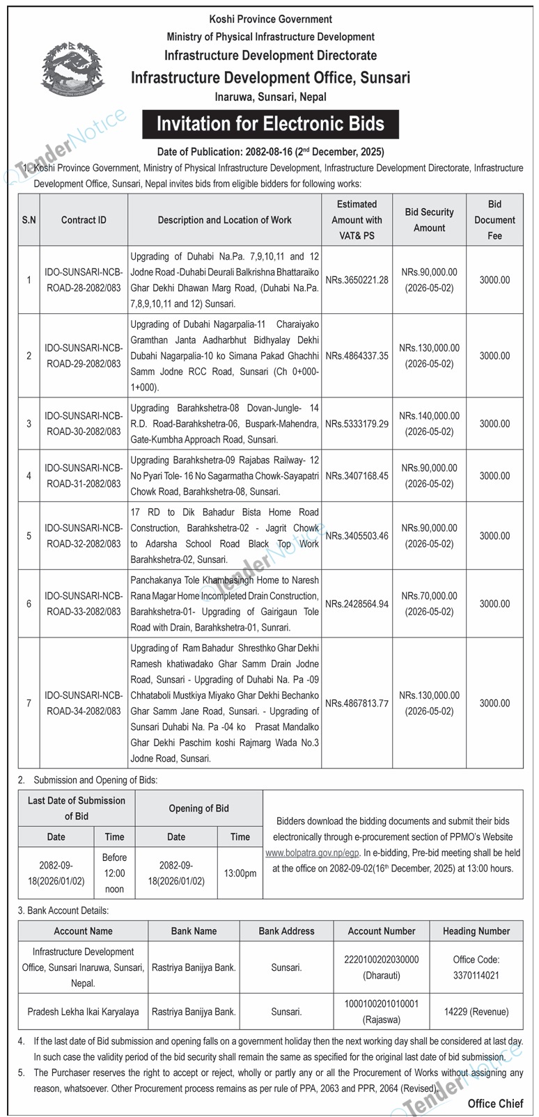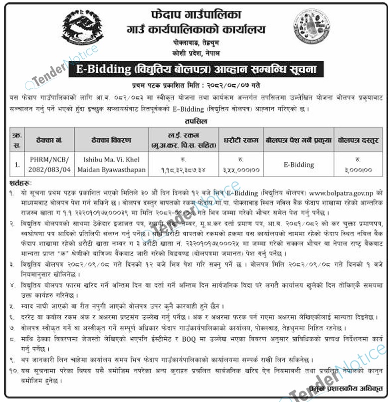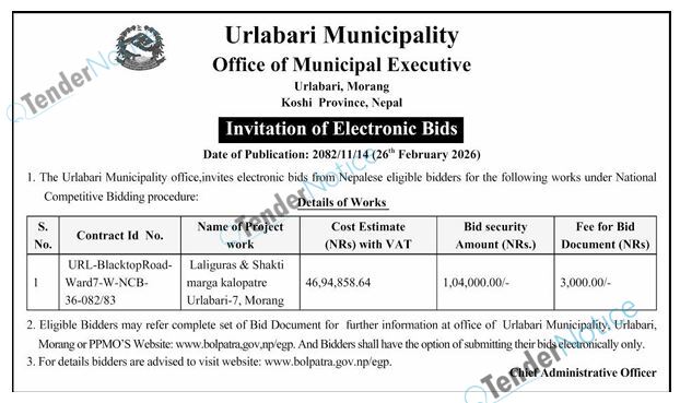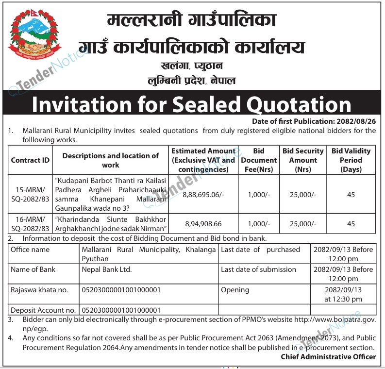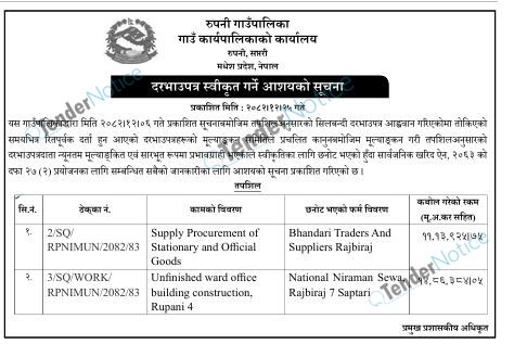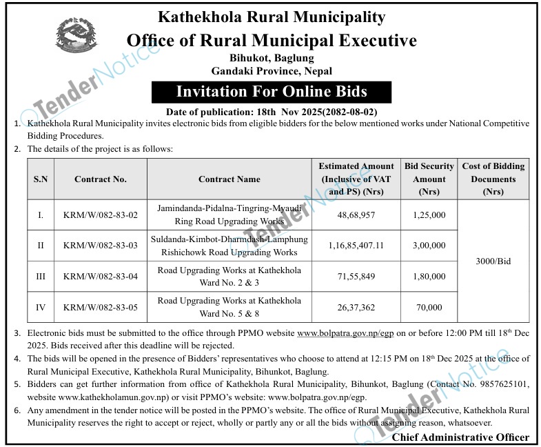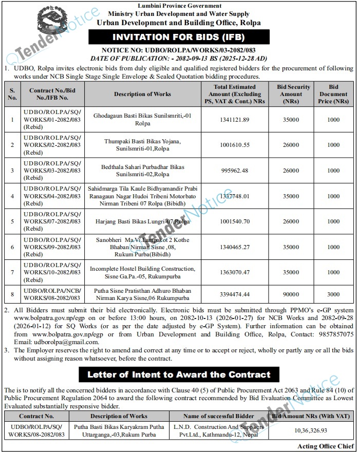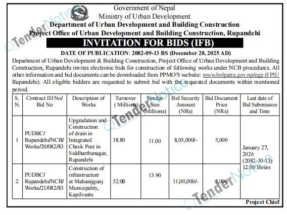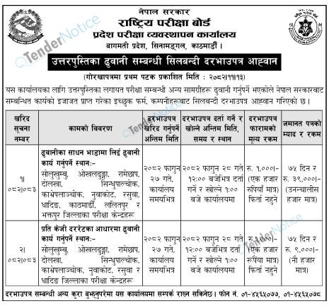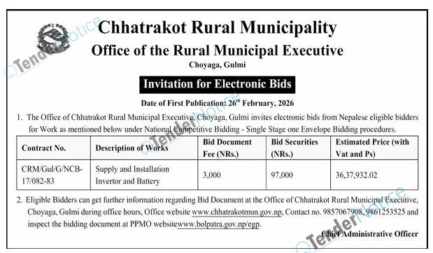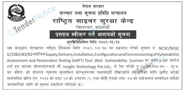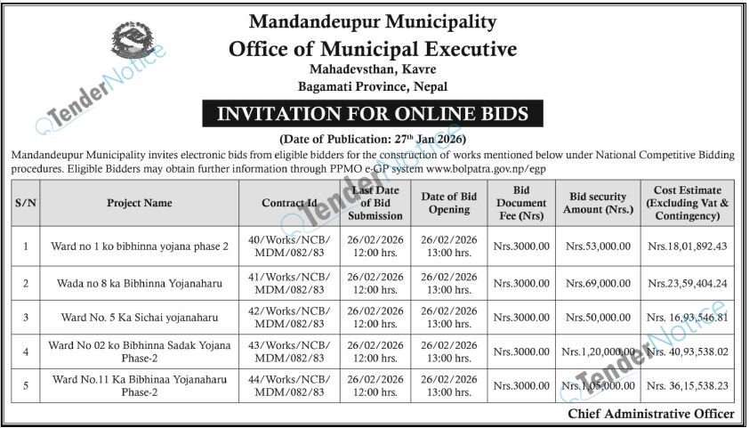 TenderNotice.com.np is one of the key sources of information for online tenders news and information. Those sources include Invitation of Proposal, Quotation, Request For Proposal (RFP) including Technical Proposal and Financial Proposal, Expression of Interest (EOI), Enlistment etc.