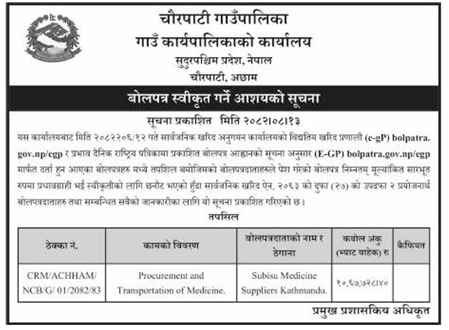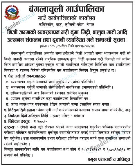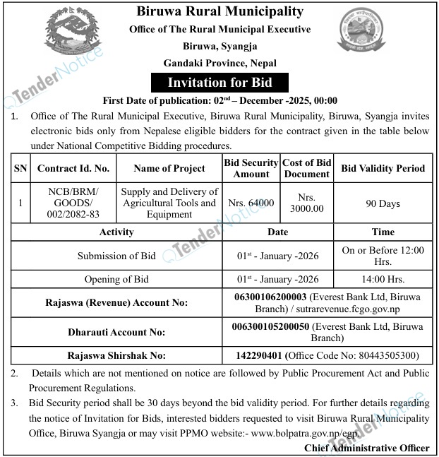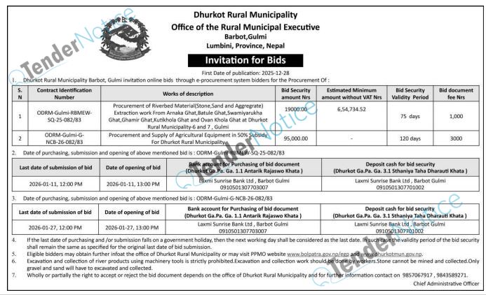 Tendernotice.com.np is an online Bid and Tender Portal Services that helps to manage all bids, tenders and related notices through website. All tender notices published in various newspapers in Nepal are collected and posted in the portal site daily basis. Users can access and download tender documents, receive through their emails right after tender publish and manage bids and tenders completely through online after registration. It simply facilitates and manages all bids and tender process in a simple manner for all users.