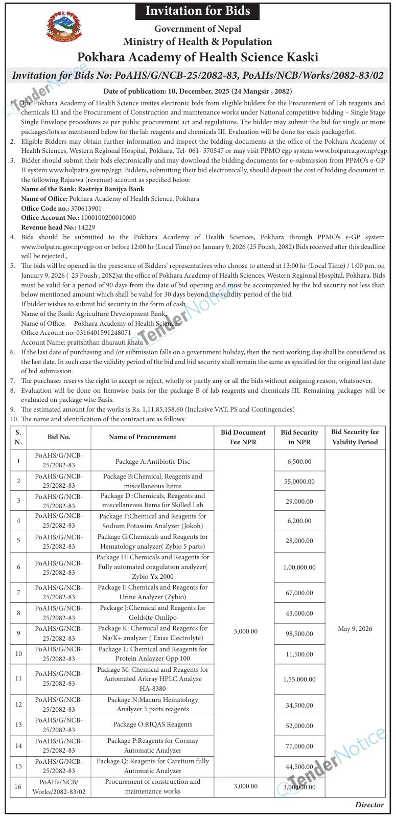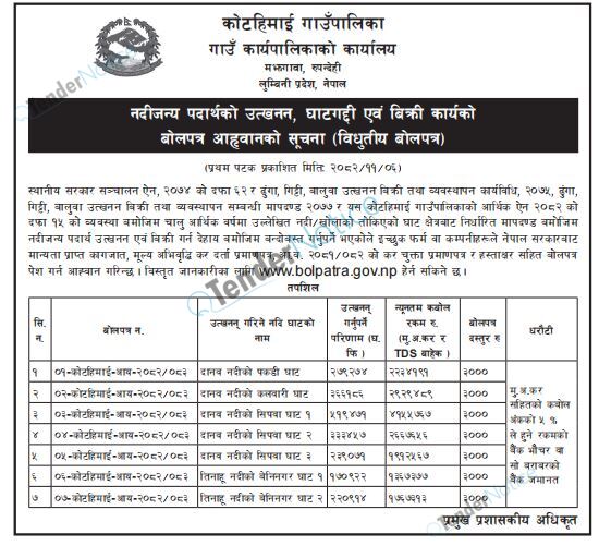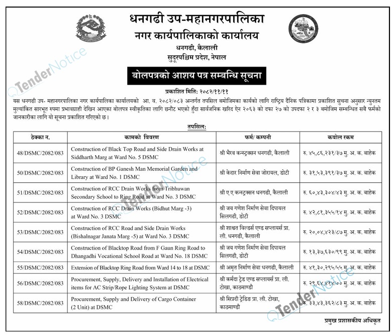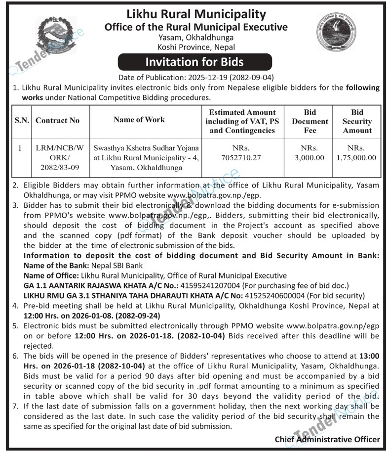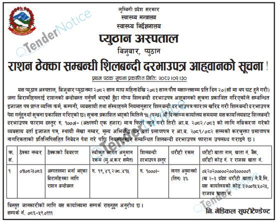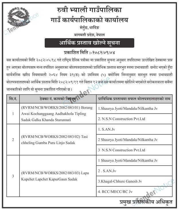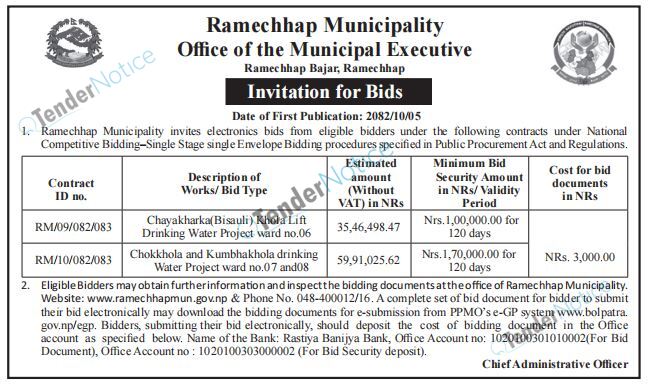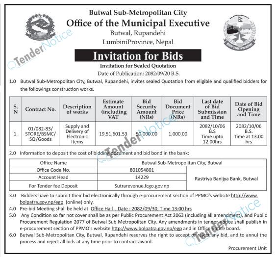 TenderNotice.com.np is one of the key sources of information for online tenders news and information. Those sources include Invitation of Proposal, Quotation, Request For Proposal (RFP) including Technical Proposal and Financial Proposal, Expression of Interest (EOI), Enlistment etc.