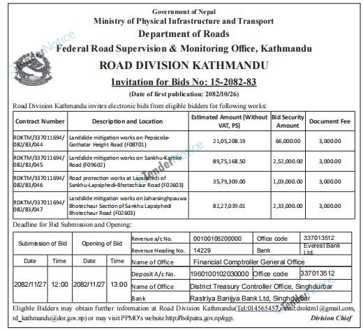 2 Road Division, Kathmandu Bid Invitation for Works 2026-02-09 2026-03-02 12:00 Tender Government/ Ministries/ Departments Construction/ Building Aarthik Dainik 21 days Tender Notice Nepal-Aarthik Dainik Tender-Road Division, Kathmandu