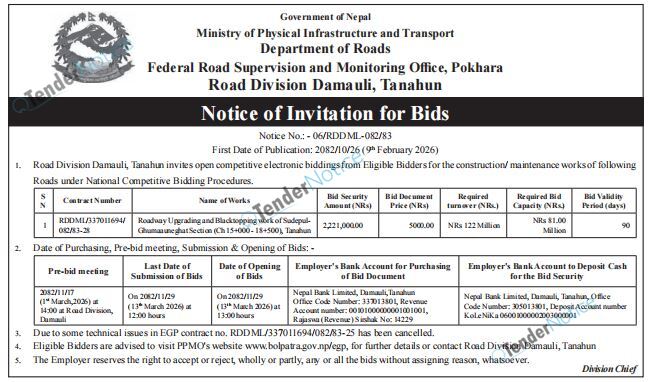 3 Road Division, Damauli, Tanahun Construction Works Bid Invitation 2026-02-09 2026-03-14 Tender Government/ Ministries/ Departments Construction/ Building Aarthik Dainik 33 days Tender Notice Nepal-Aarthik Dainik Tender-Road Division, Damauli, Tanahun