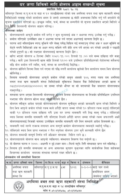 4 Arunima Saving and Credit Co-operative, Lalitpur House Sale Bid Invitation 2026-02-09 2026-02-15 Tender Banking/ Finance /Insurance Real Estate Aarthik Dainik 6 days Tender Notice Nepal-Aarthik Dainik Tender-Arunima Saving and Credit Co-operative, Lalitpur