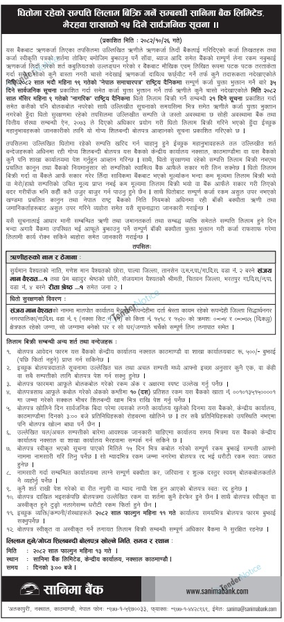 5 Sanima Bank Limited, Alkapuri, Nakshal, Kathmandu Collateral Assets Auction 2026-02-09 2026-02-23 Auction Banking/ Finance /Insurance Collateral Assets Aarthik Dainik 14 days Tender Notice Nepal-Aarthik Dainik Auction-Sanima Bank Limited, Alkapuri, Nakshal, Kathmandu