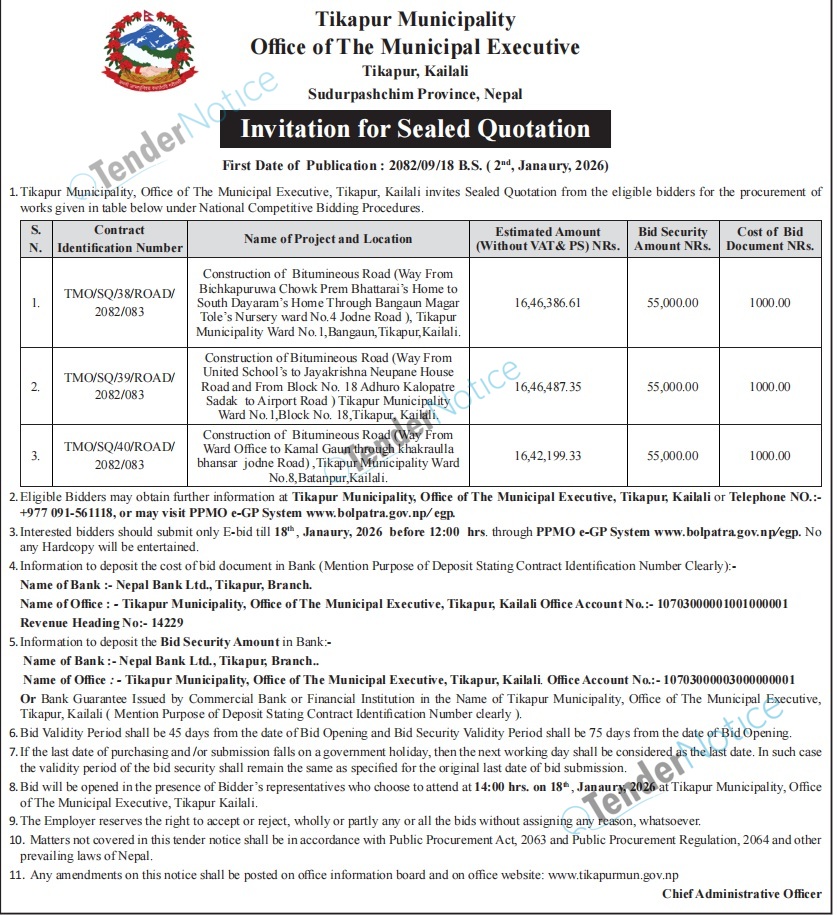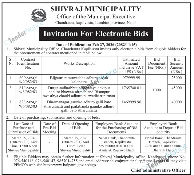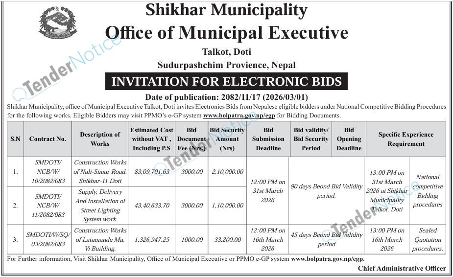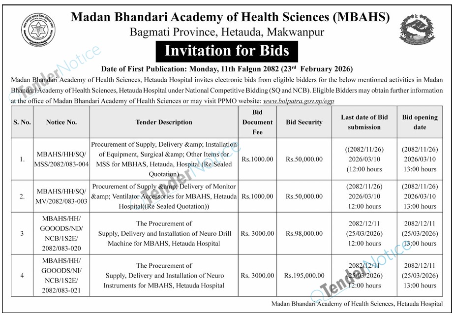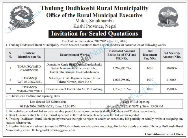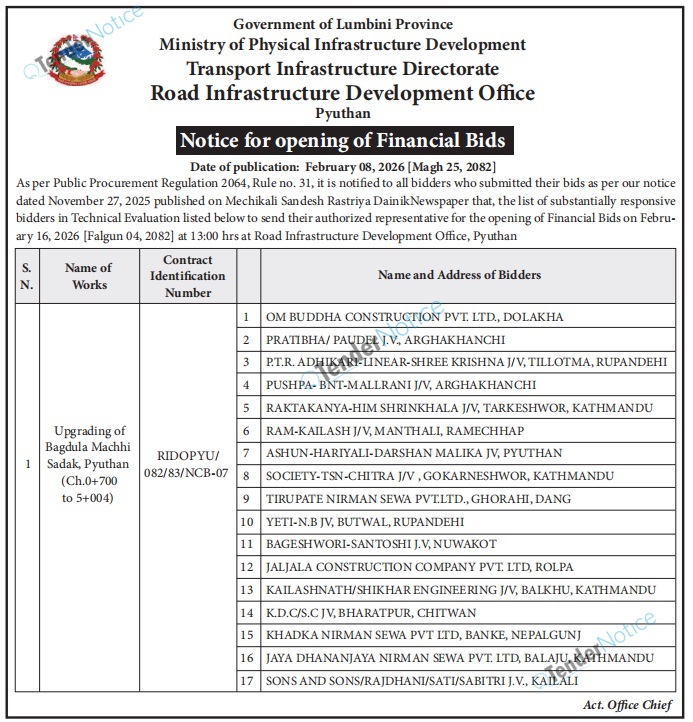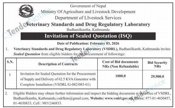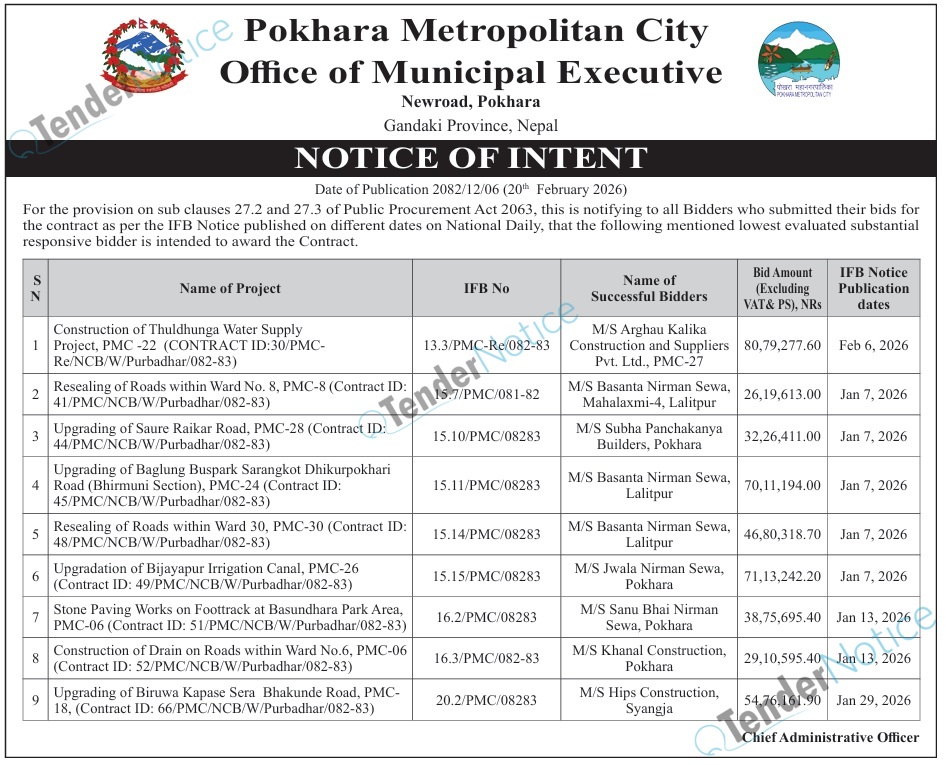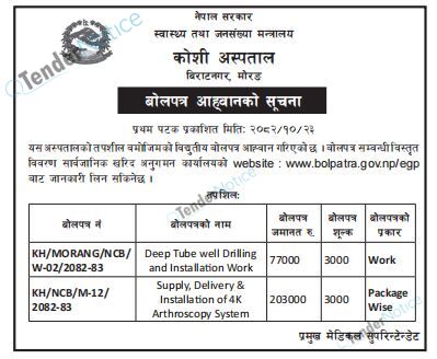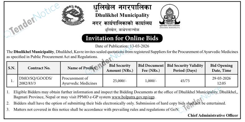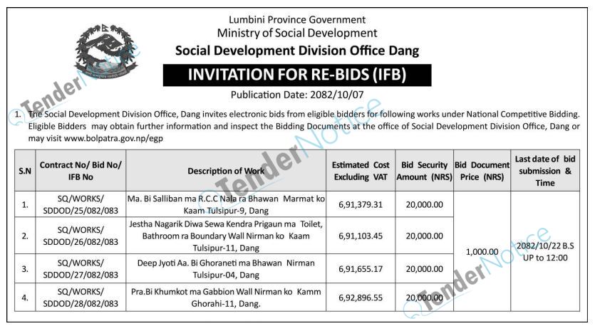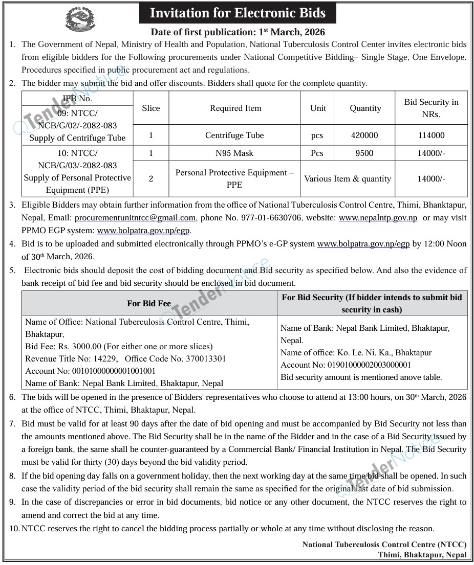 TenderNotice.com.np is one of the key sources of information for online tenders news and information. Those sources include Invitation of Proposal, Quotation, Request For Proposal (RFP) including Technical Proposal and Financial Proposal, Expression of Interest (EOI), Enlistment etc.