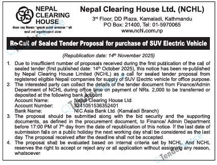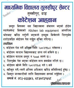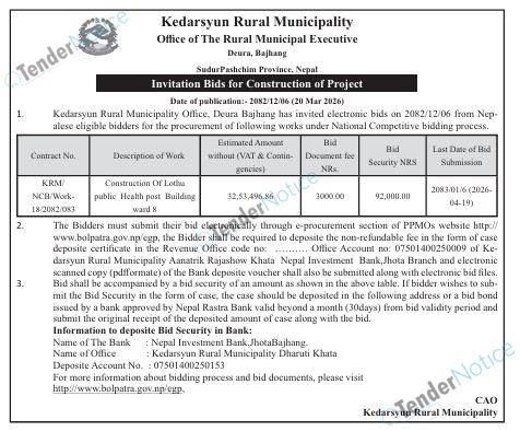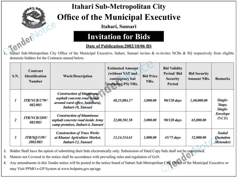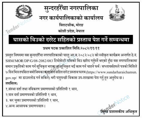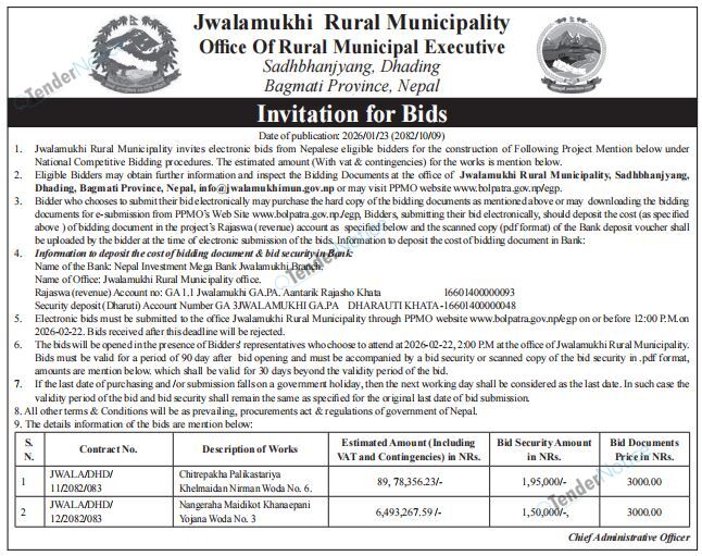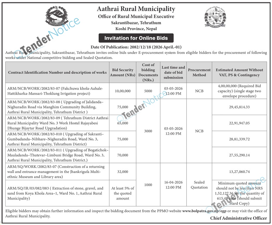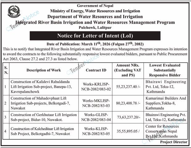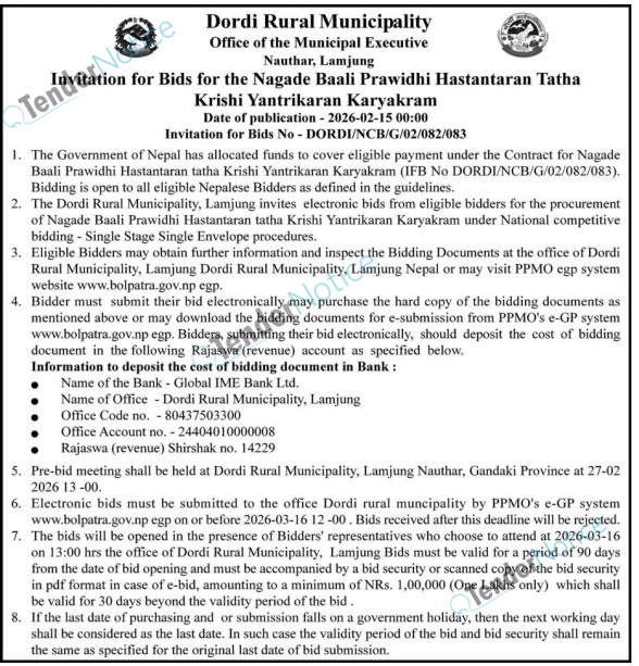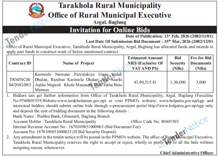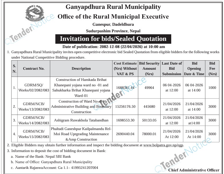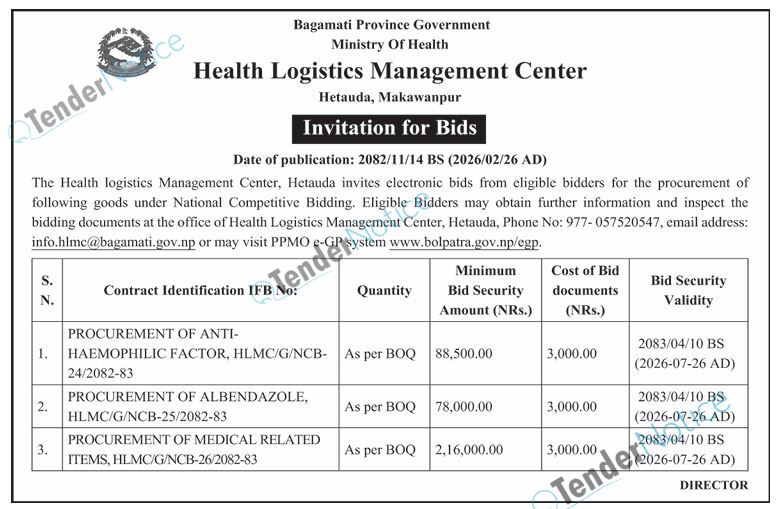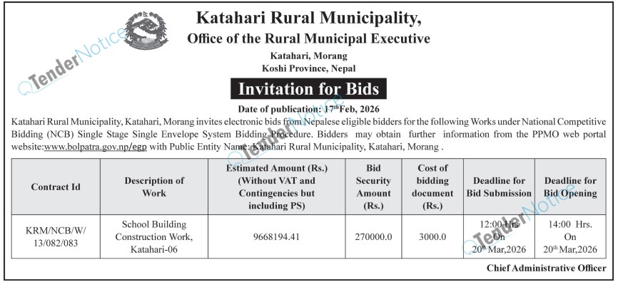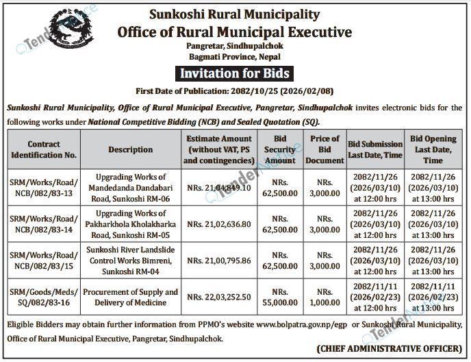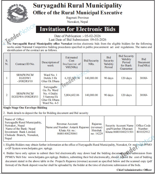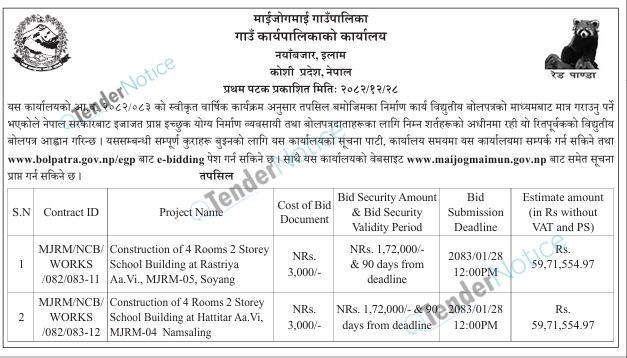 TenderNotice.com.np is one of the key sources of information for online tenders news and information. Those sources include Invitation of Proposal, Quotation, Request For Proposal (RFP) including Technical Proposal and Financial Proposal, Expression of Interest (EOI), Enlistment etc.