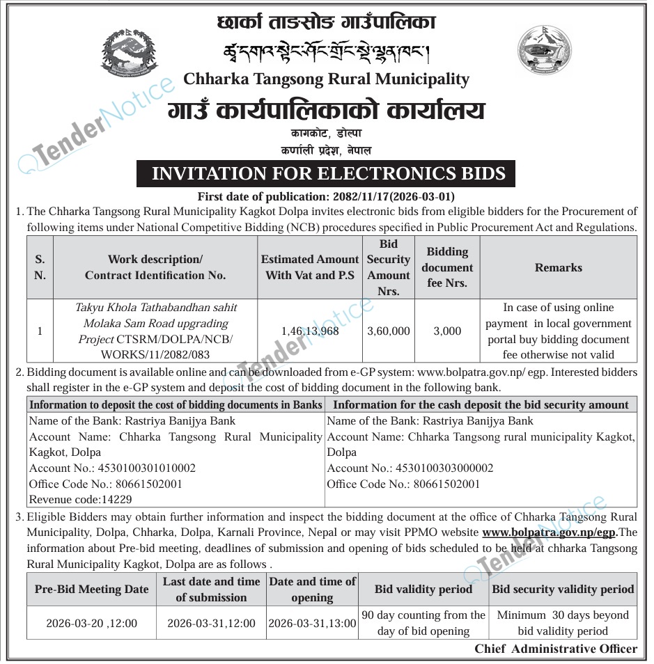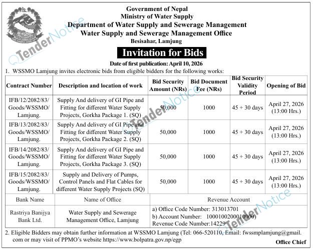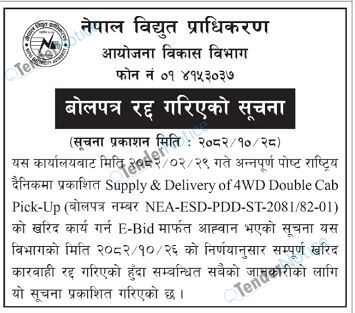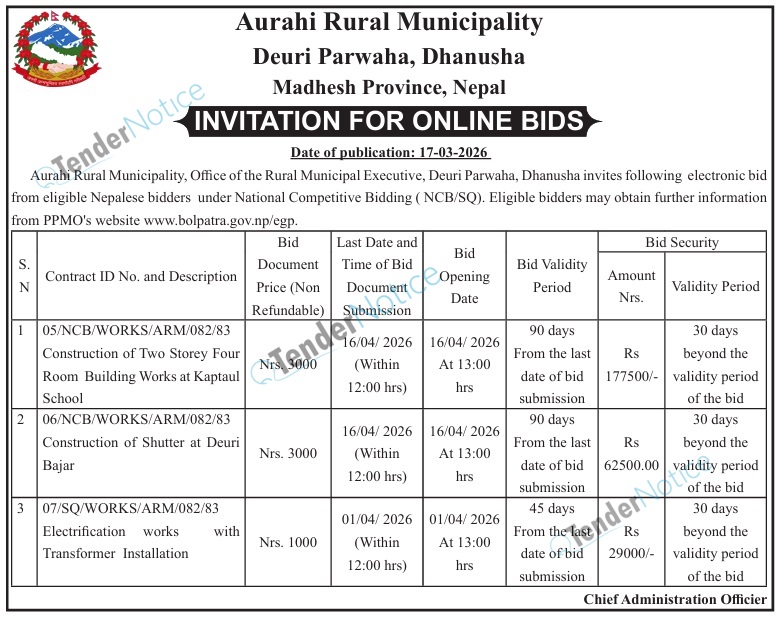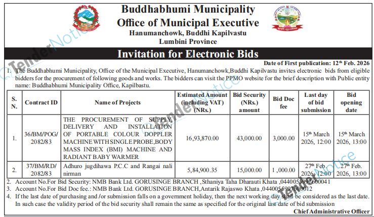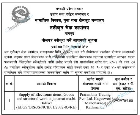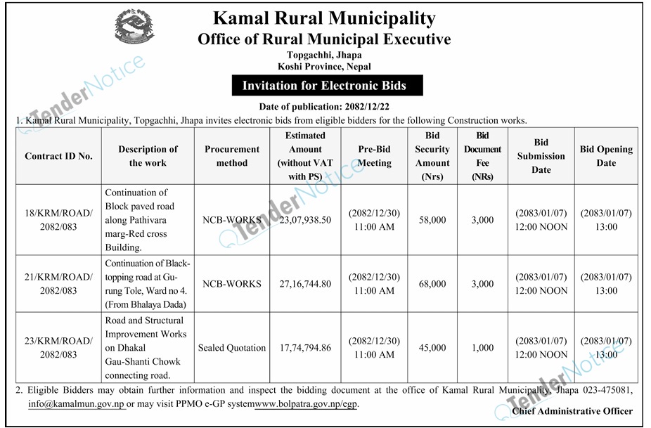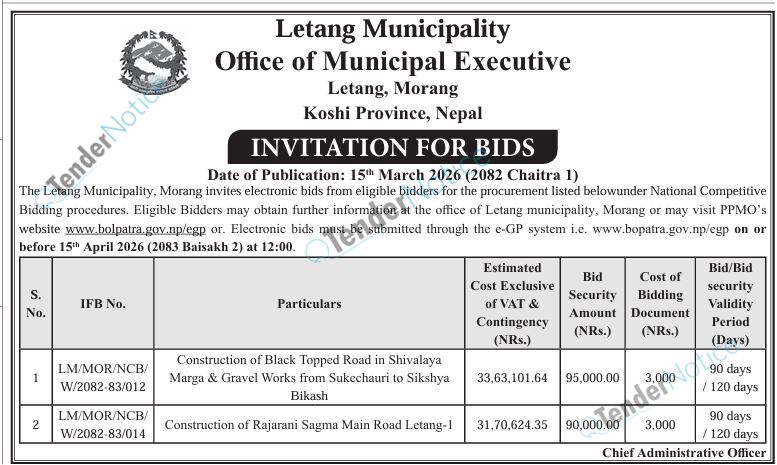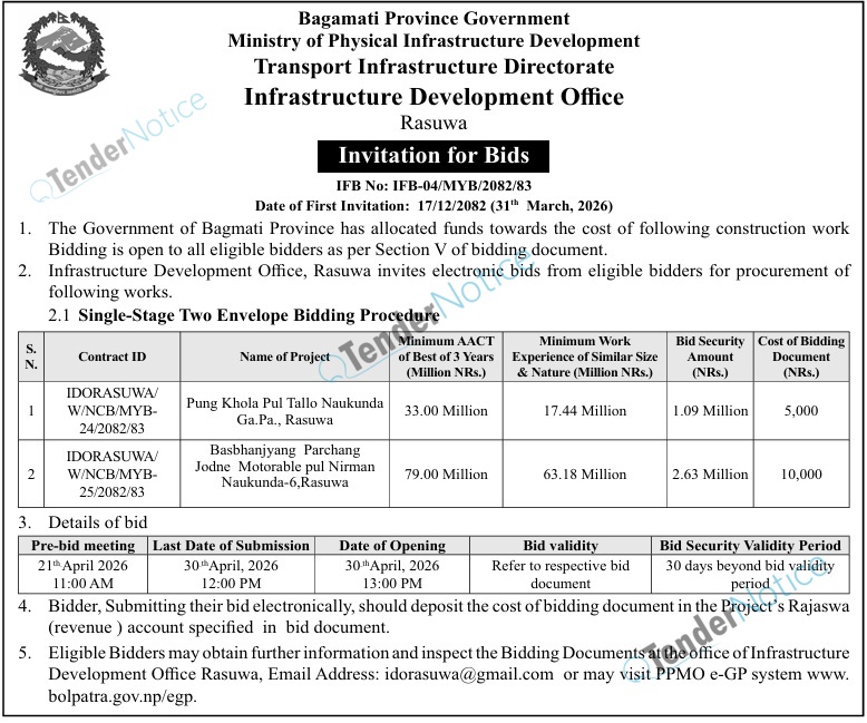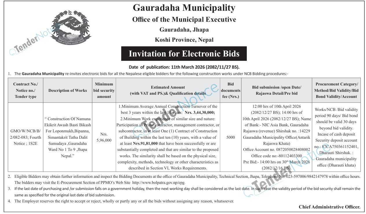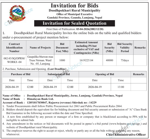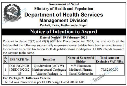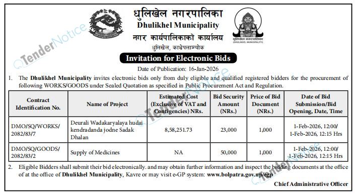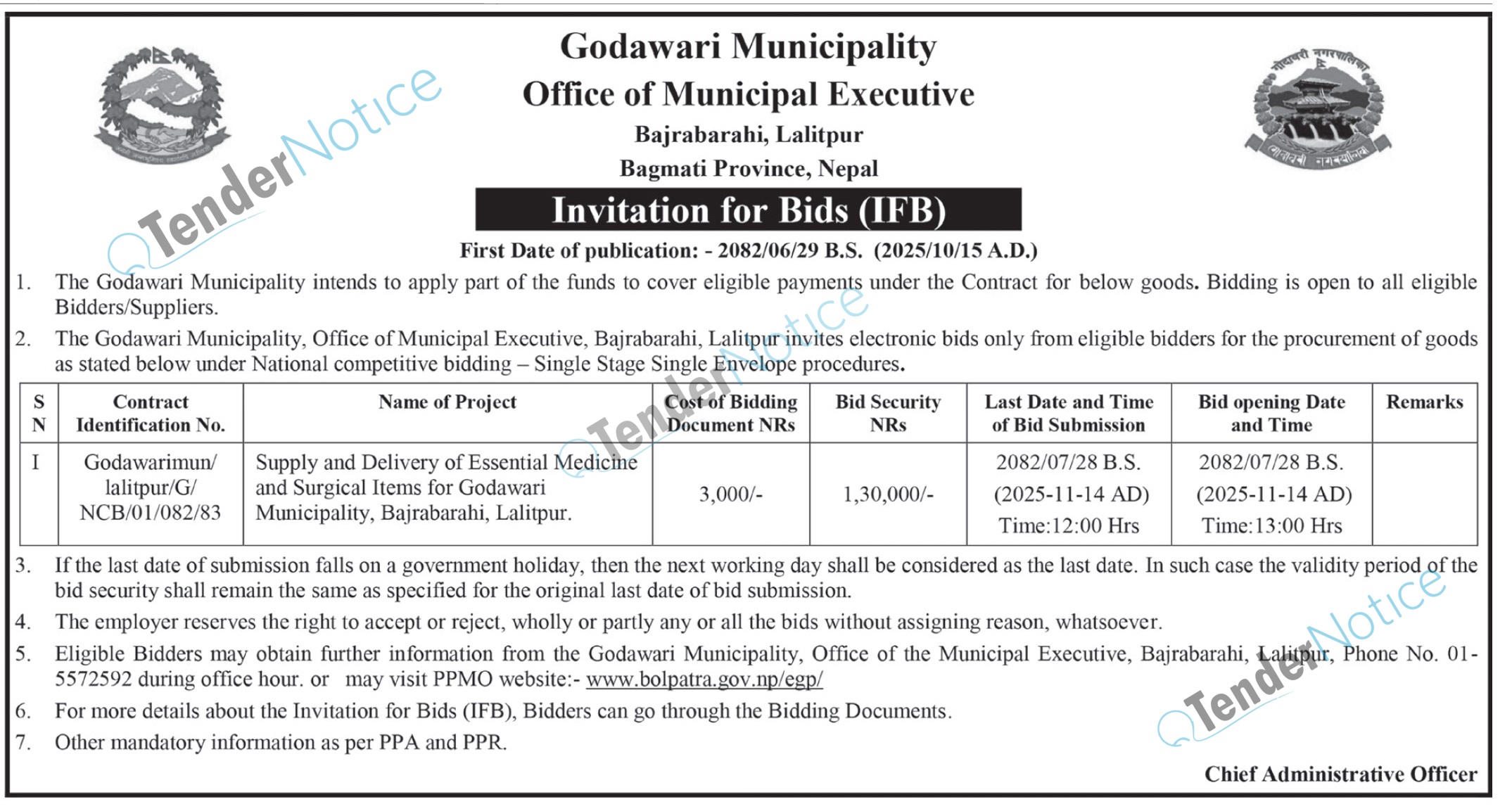TenderNotice.com.np is one of the key sources of information for online tenders news and information. Those sources include Invitation of Proposal, Quotation, Request For Proposal (RFP) including Technical Proposal and Financial Proposal, Expression of Interest (EOI), Enlistment etc.