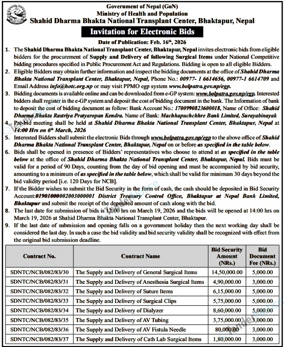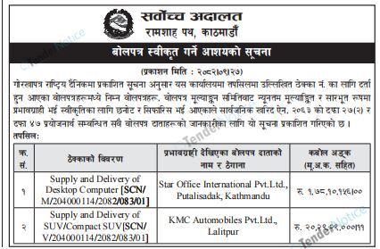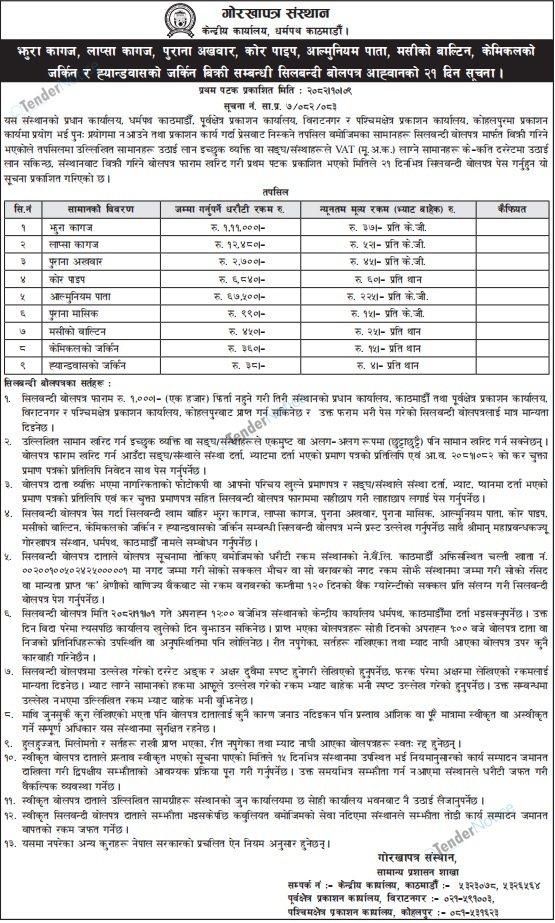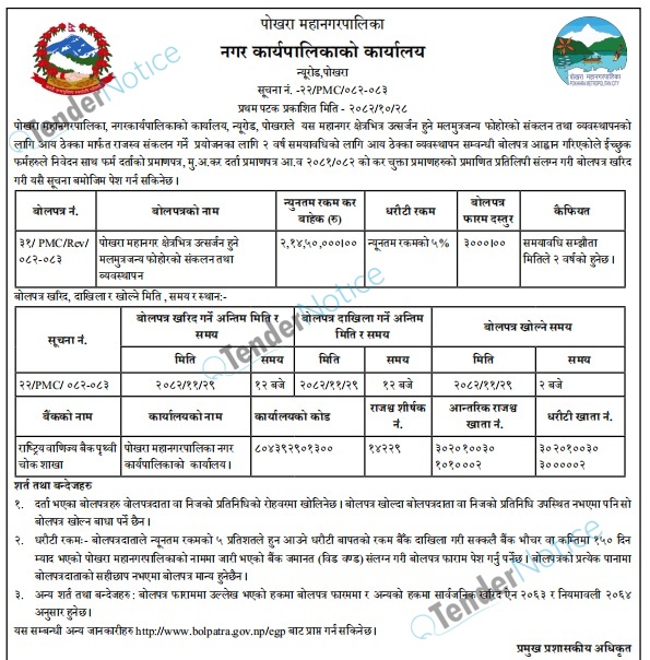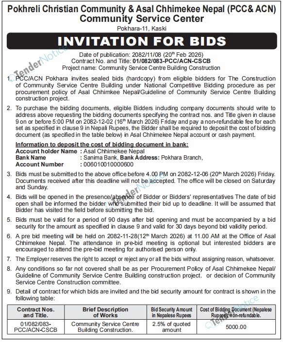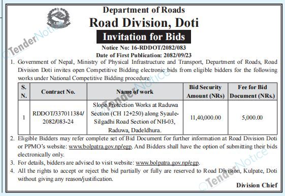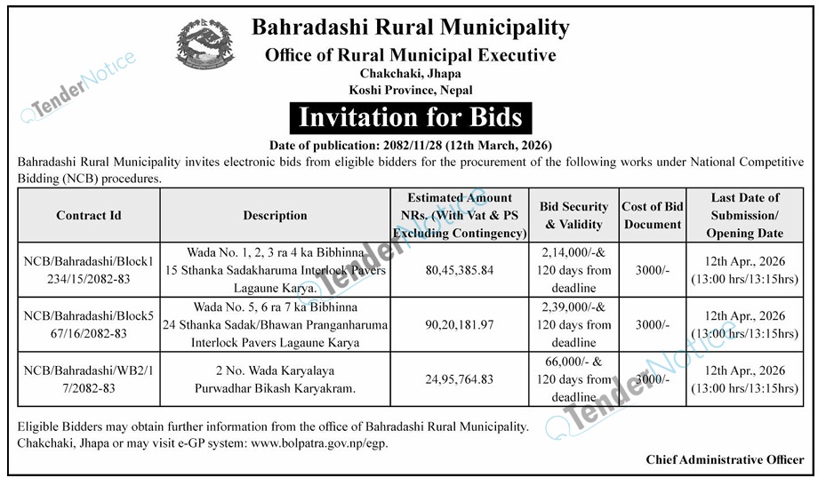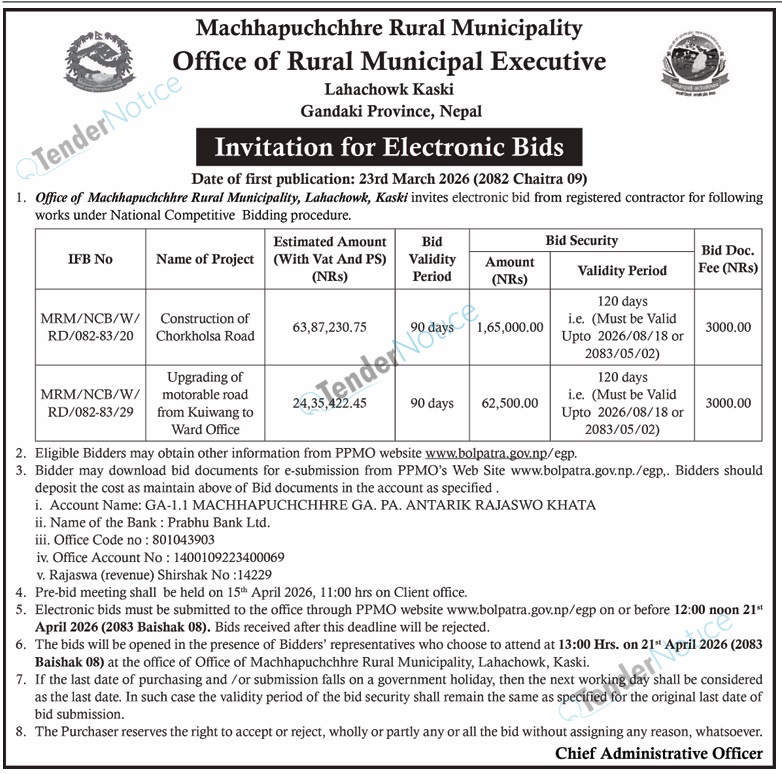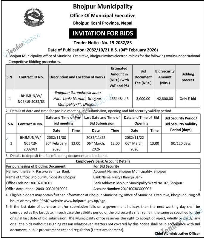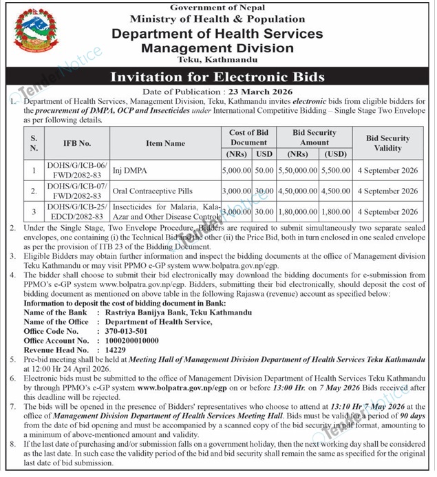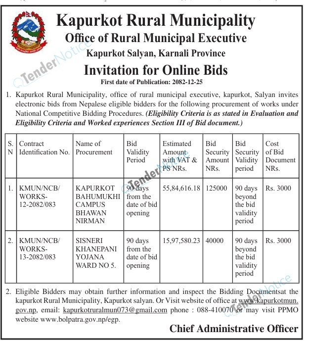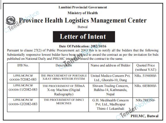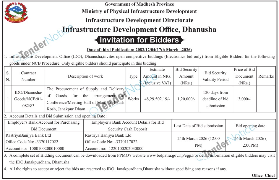 TenderNotice.com.np is one of the key sources of information for online tenders news and information. Those sources include Invitation of Proposal, Quotation, Request For Proposal (RFP) including Technical Proposal and Financial Proposal, Expression of Interest (EOI), Enlistment etc.