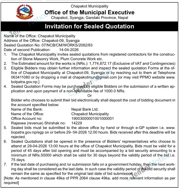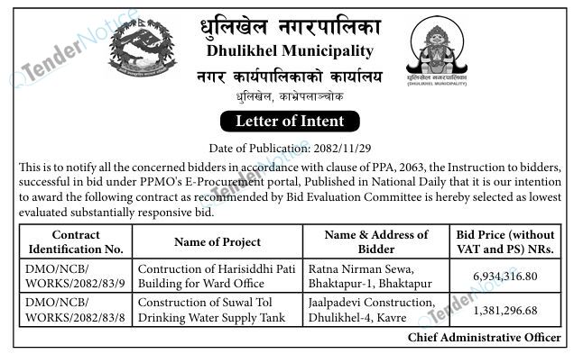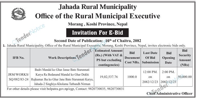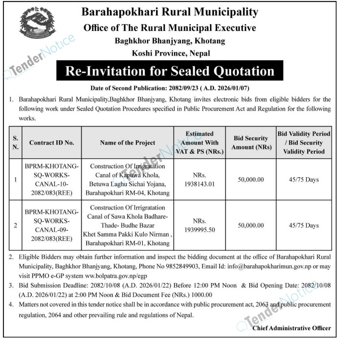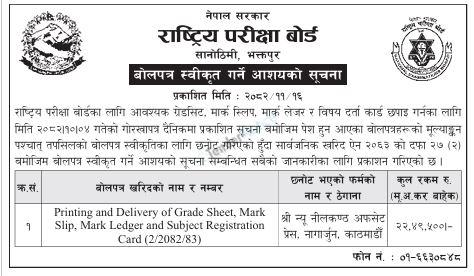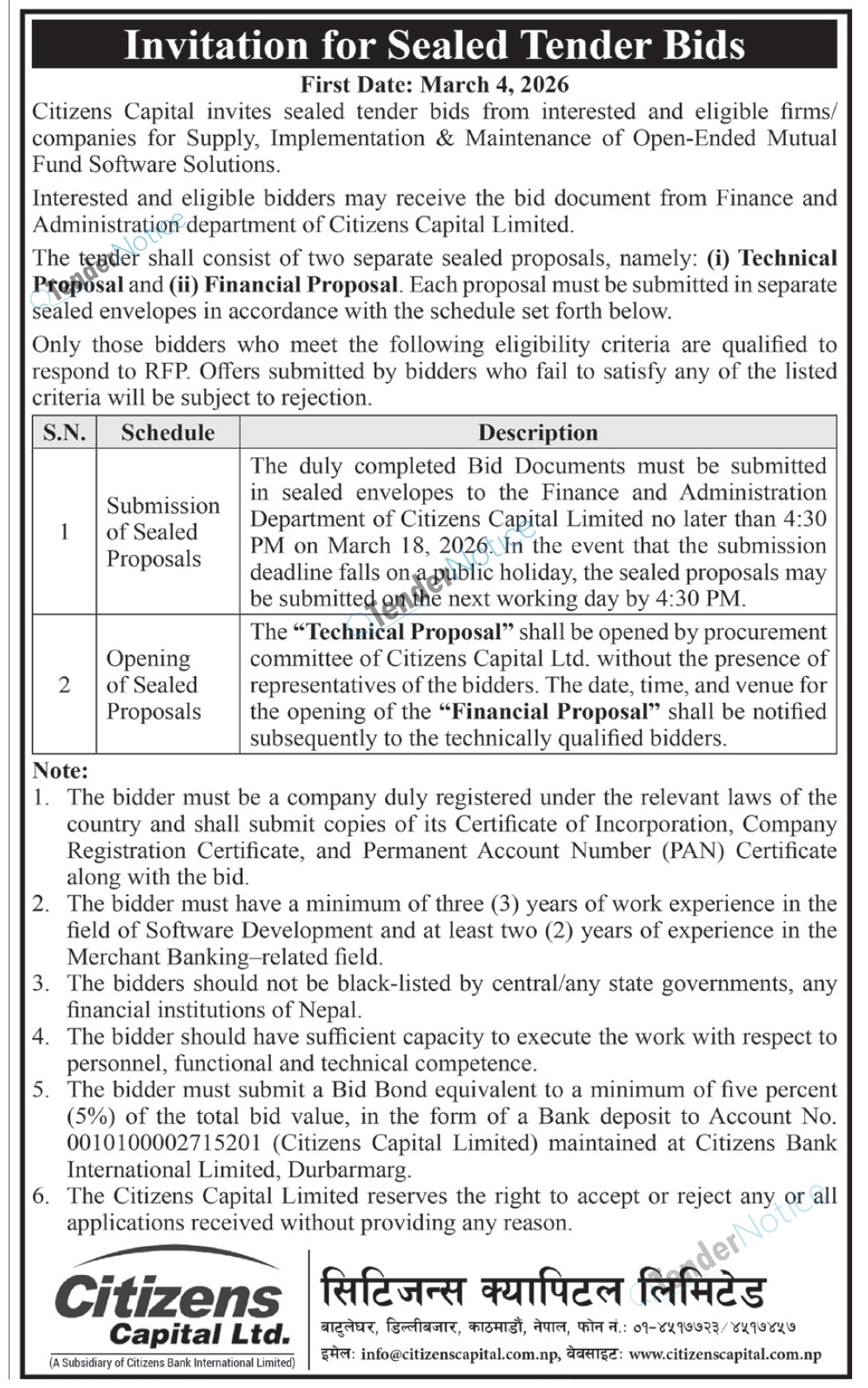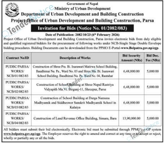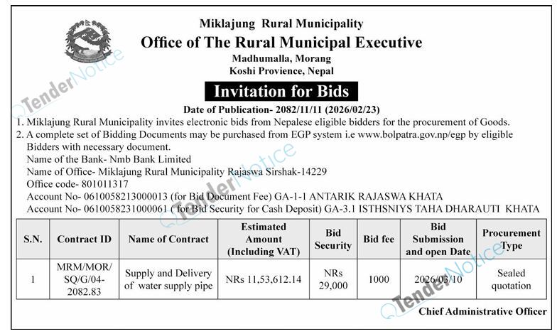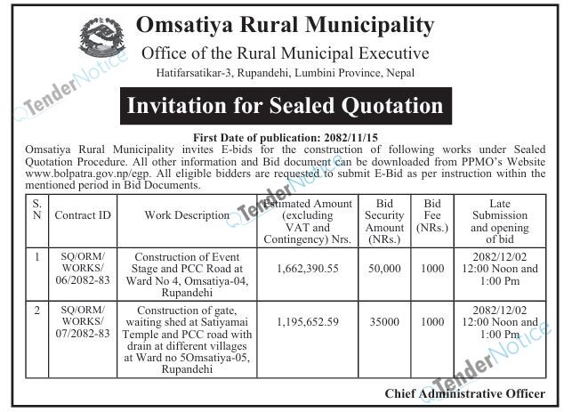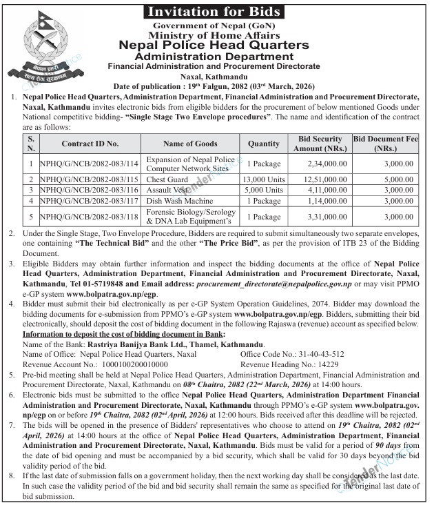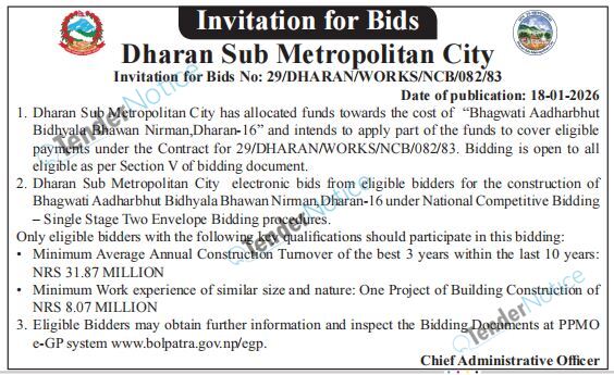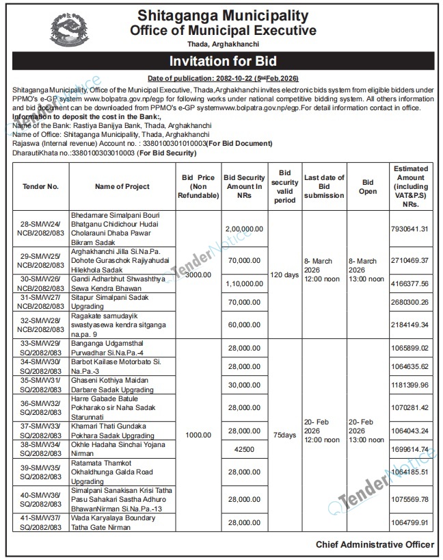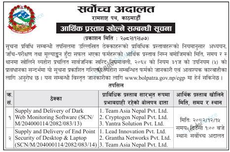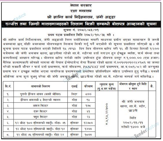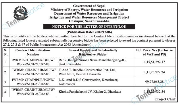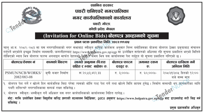 TenderNotice.com.np is one of the key sources of information for online tenders news and information. Those sources include Invitation of Proposal, Quotation, Request For Proposal (RFP) including Technical Proposal and Financial Proposal, Expression of Interest (EOI), Enlistment etc.