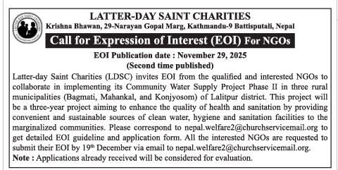 1 Latter Day Saint Charities, Kathmandu Expression of Interest for NGOs 2025-11-29 2025-12-19 Expression Of Interest Government/ Ministries/ Departments GOODS & Services Gorkhapatra 20 days Tender Notice Nepal-Gorkhapatra Expression Of Interest-Latter Day Saint Charities, Kathmandu