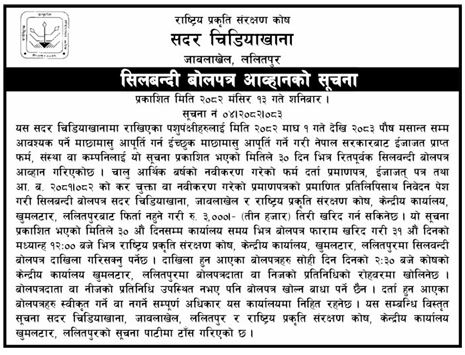 2 Sardar Chidiyakhana, Lalitpur Goods Bid Invitation 2025-11-29 2025-12-29 12:00 Tender Government/ Ministries/ Departments GOODS & Services Gorkhapatra 30 days Tender Notice Nepal-Gorkhapatra Tender-Sardar Chidiyakhana, Lalitpur