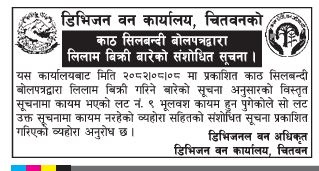 3 Division Forest Office, Chitwan Kath Auction Sale Notice 2025-11-29 2025-11-29 Auction Government/ Ministries/ Departments Kath/Daura Gorkhapatra Today Tender Notice Nepal-Gorkhapatra Auction-Division Forest Office, Chitwan