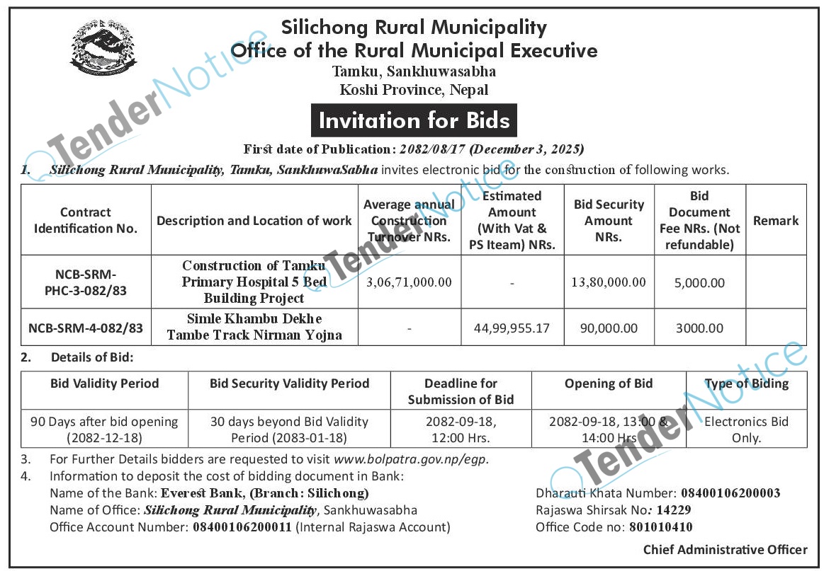1 Silichong Rural Municipality, Sankhuwasabha Construction Works Bid Invitation 2025-12-03 2026-01-03 12:00 Tender Government/ Ministries/ Departments Construction/ Building Rajdhani 28 days Tender Notice Nepal-Rajdhani Tender-Silichong Rural Municipality, Sankhuwasabha