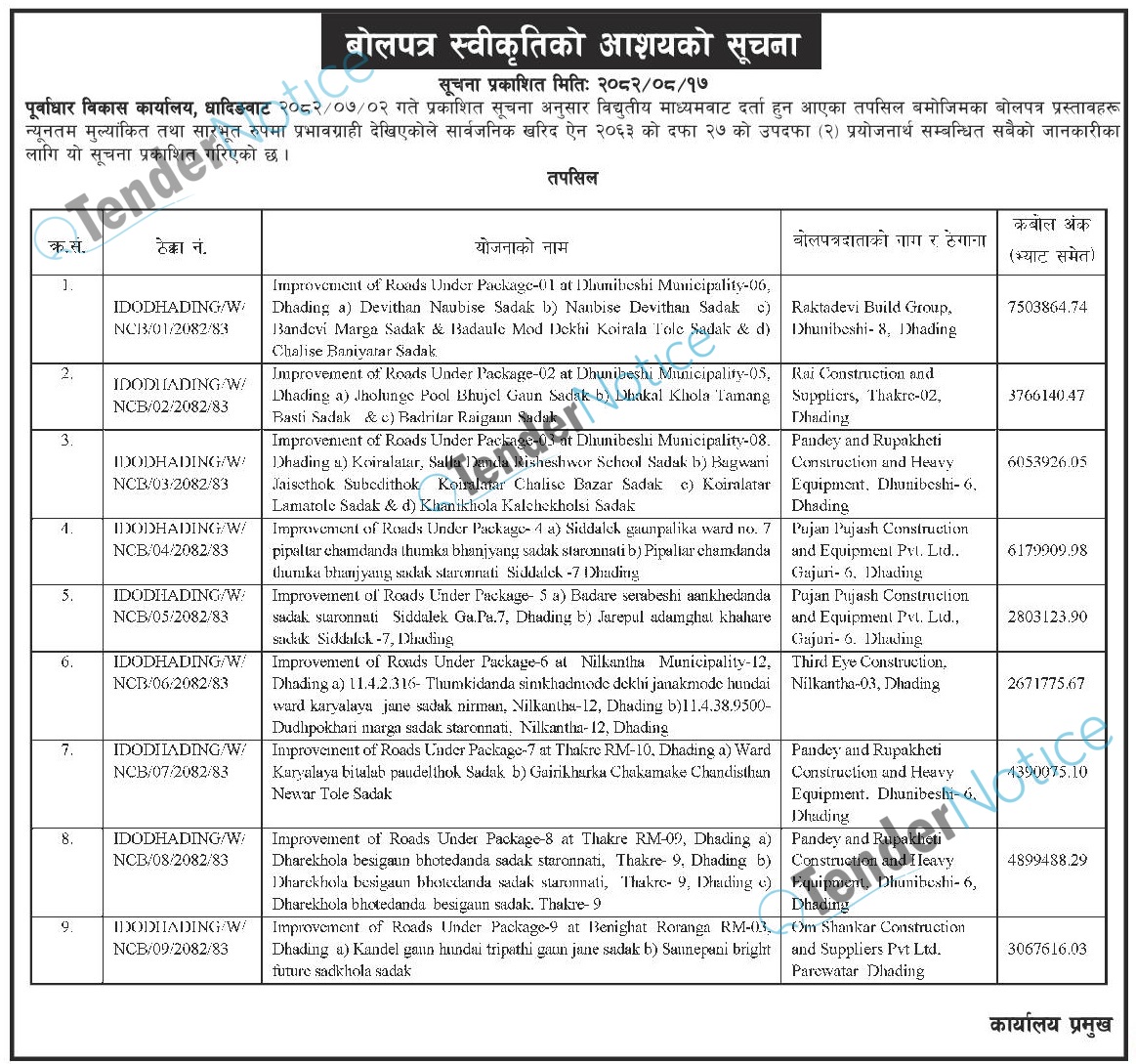 2 Infrastructure Development Office, Dhading Works Bid Award Notice 2025-12-03 2025-12-09 Award Notice Government/ Ministries/ Departments Construction/ Building Rajdhani 3 days Tender Notice Nepal-Rajdhani Award Notice-Infrastructure Development Office, Dhading