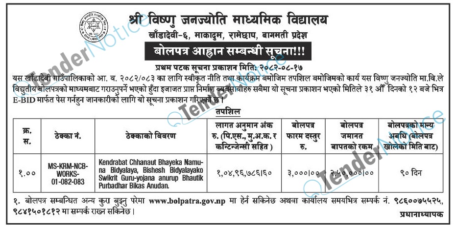 3 Shree Vishnu Janjoti Madhyamik Vidhyalaya, Ramechhap Bid Invitation for Works 2025-12-03 2026-01-02 12:00 Tender Education - Colleges, Universities & Schools Construction/ Building Rajdhani 27 days Tender Notice Nepal-Rajdhani Tender-Shree Vishnu Janjoti Madhyamik Vidhyalaya, Ramechhap