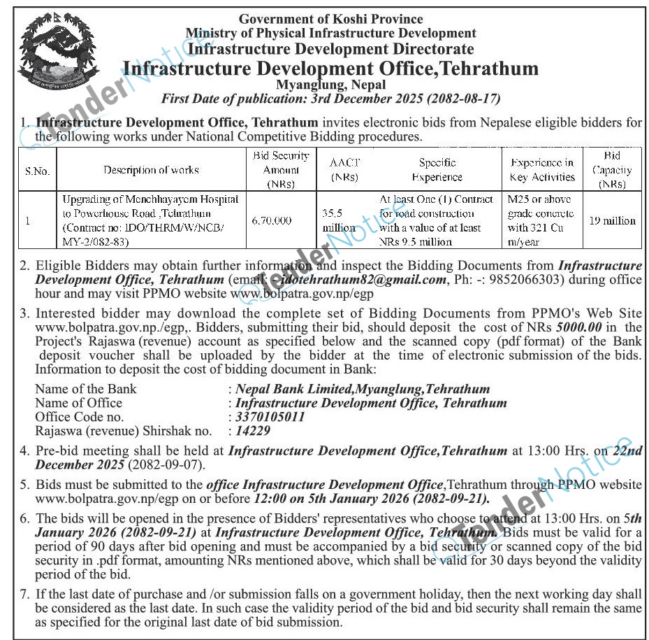 4 Infrastructure Development Office, Tehrathum Upgrading Construction Works Bid Invitation 2025-12-03 2026-01-06 12:00 Tender Government/ Ministries/ Departments Construction/ Building Rajdhani 31 days Tender Notice Nepal-Rajdhani Tender-Infrastructure Development Office, Tehrathum