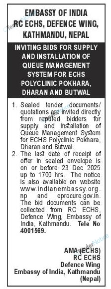5 Embassy of India, Kathmandu Goods Bid Invitation 2025-12-03 2025-12-23 17:00 Tender Government/ Ministries/ Departments GOODS & Services Rajdhani 17 days Tender Notice Nepal-Rajdhani Tender-Embassy of India, Kathmandu