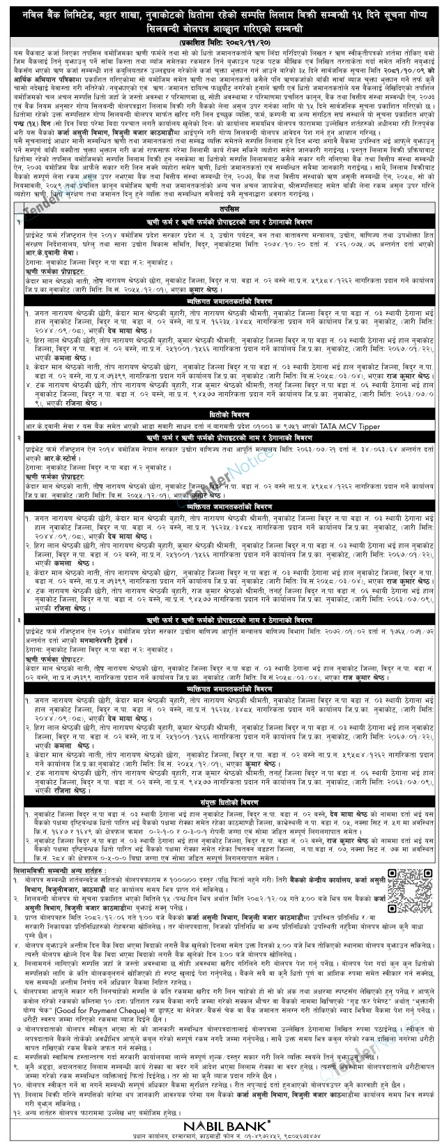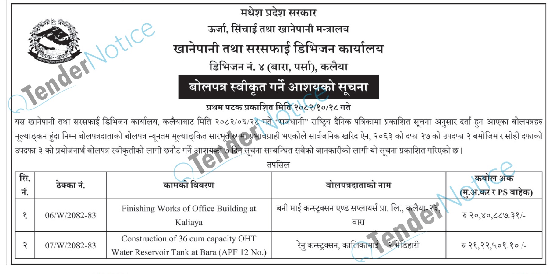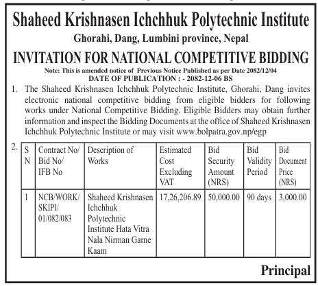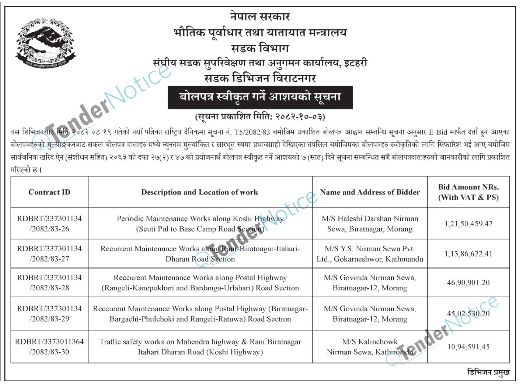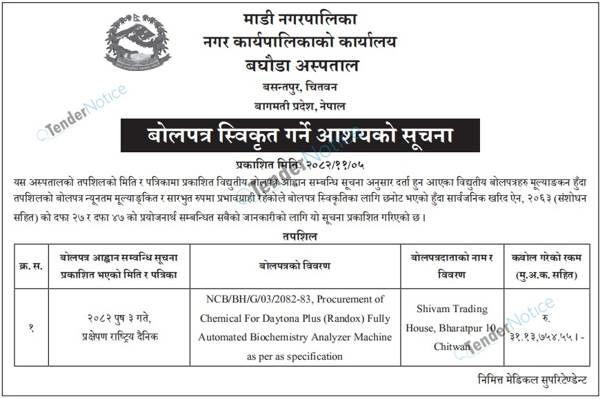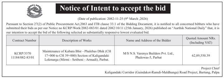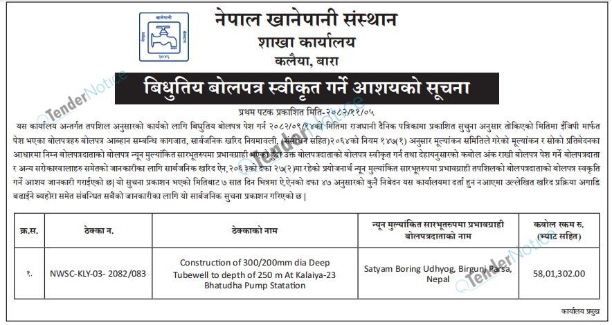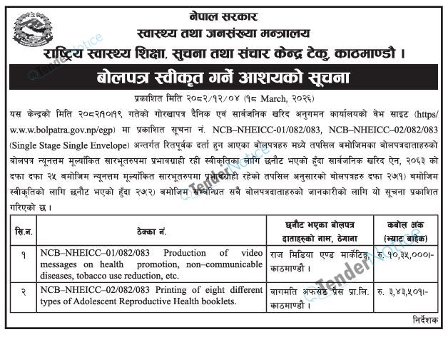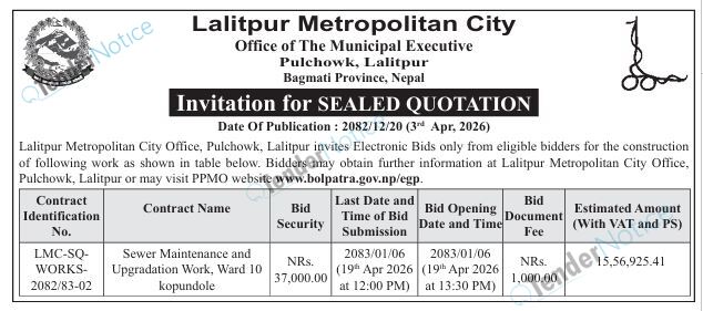 Tendernotice.com.np is an online Bid and Tender Portal Services that helps to manage all bids, tenders and related notices through website. All tender notices published in various newspapers in Nepal are collected and posted in the portal site daily basis. Users can access and download tender documents, receive through their emails right after tender publish and manage bids and tenders completely through online after registration. It simply facilitates and manages all bids and tender process in a simple manner for all users.